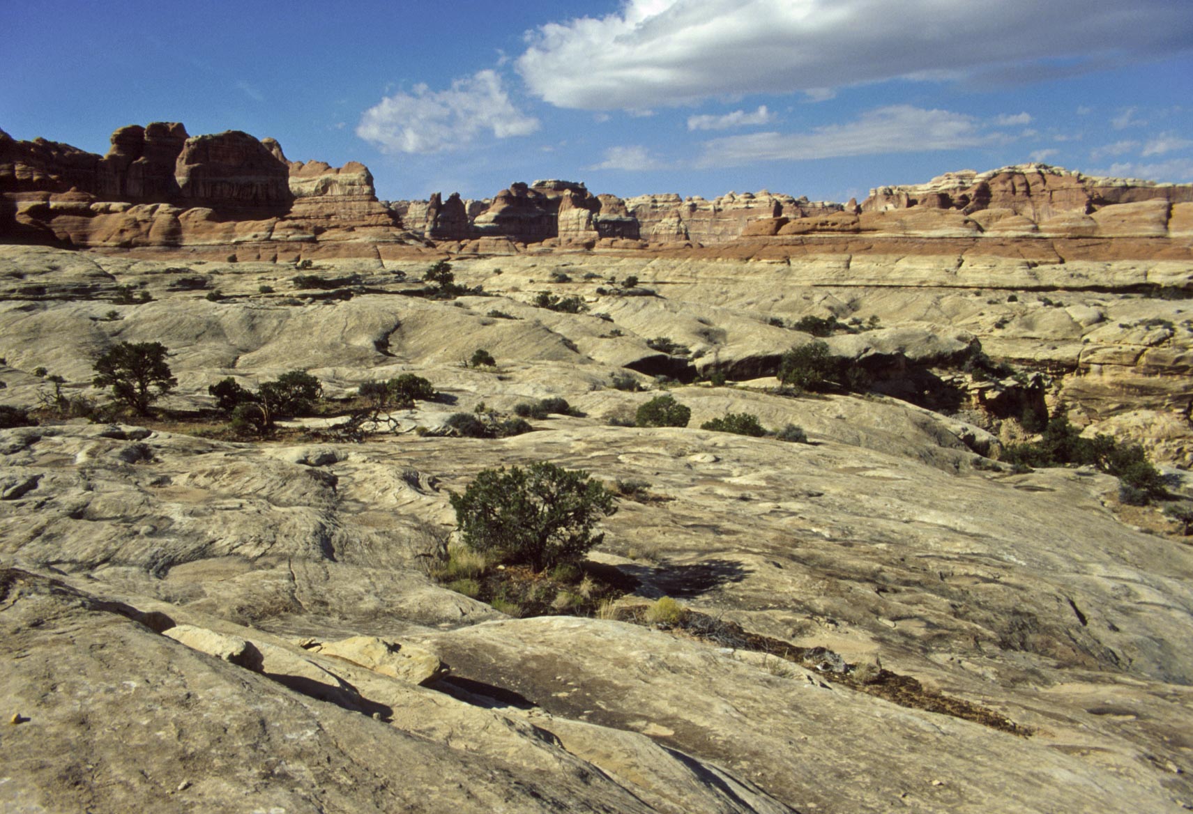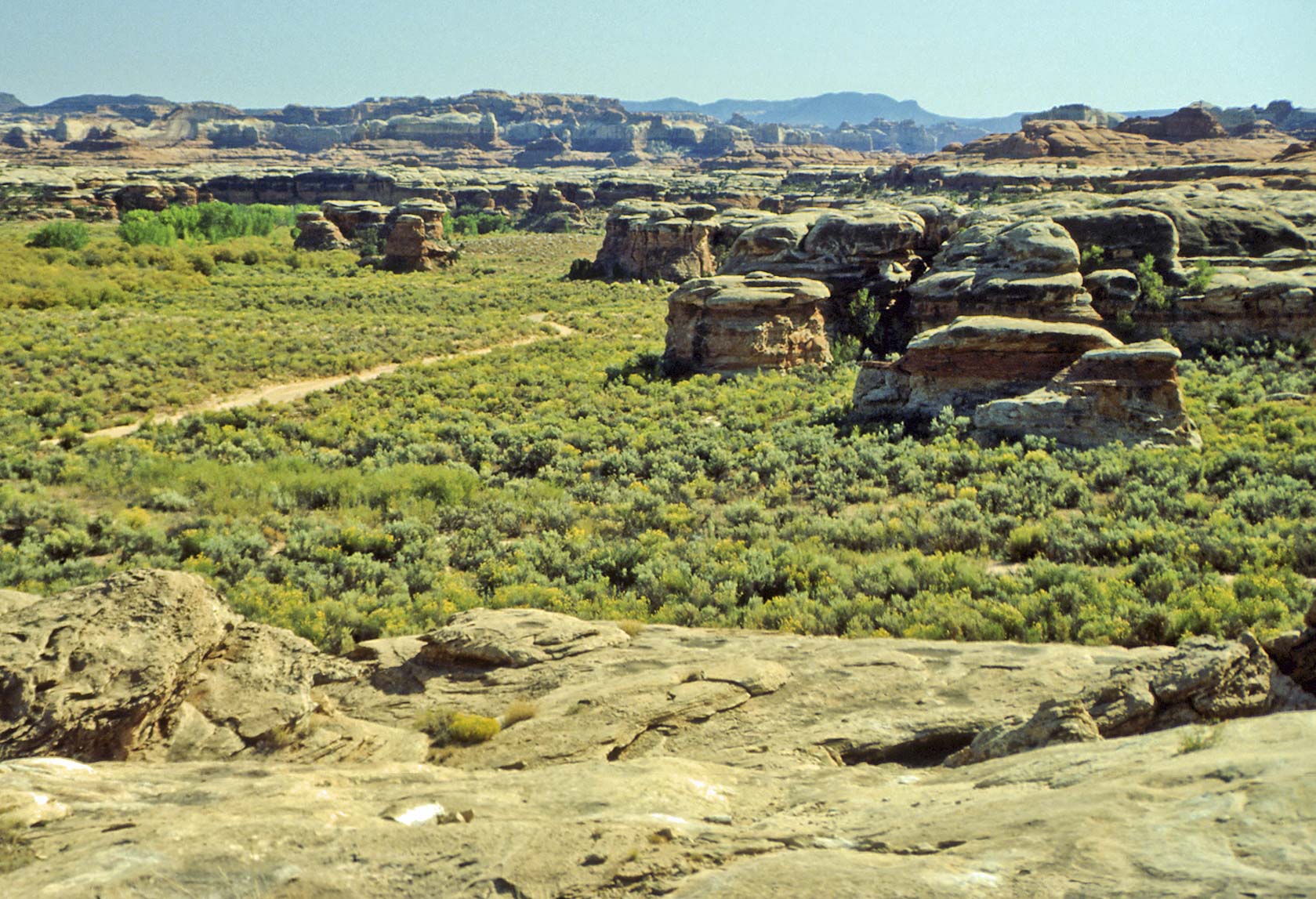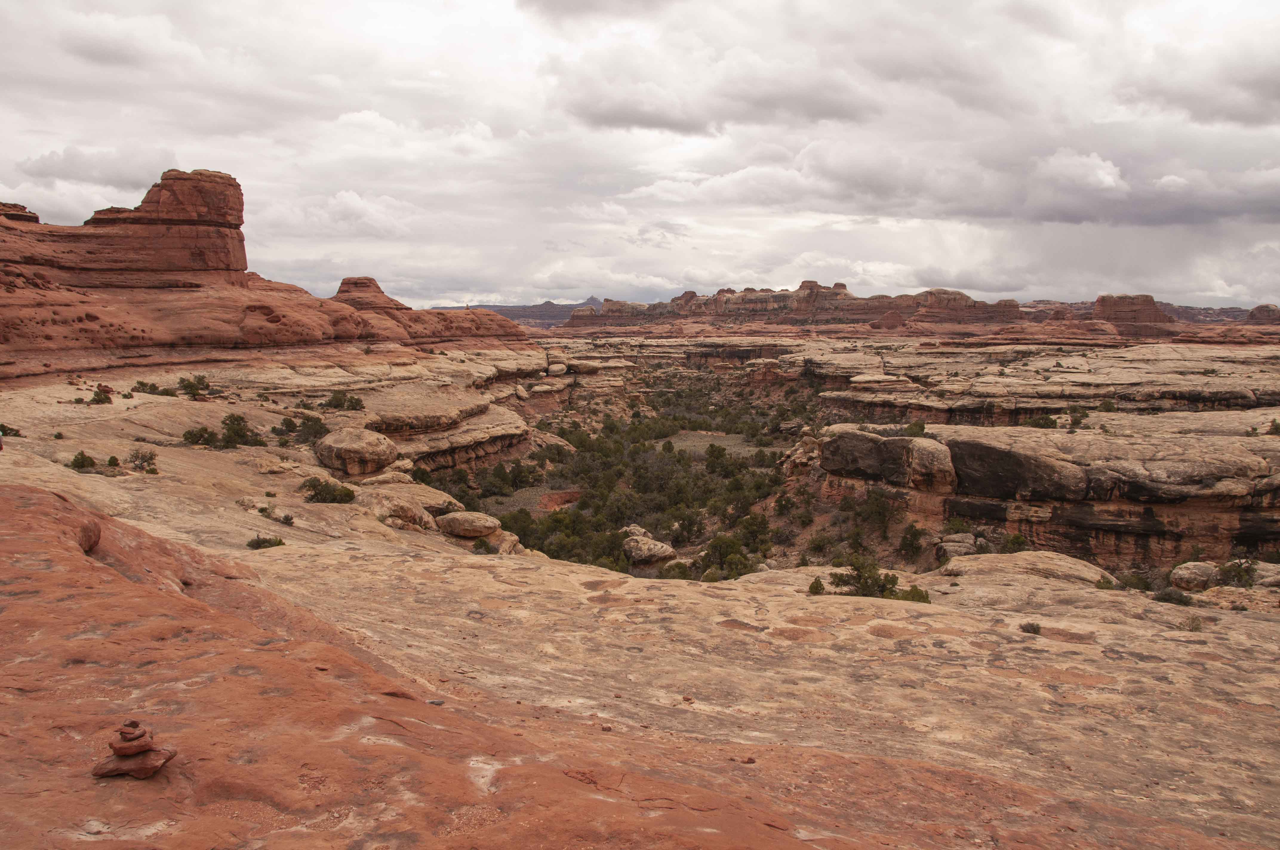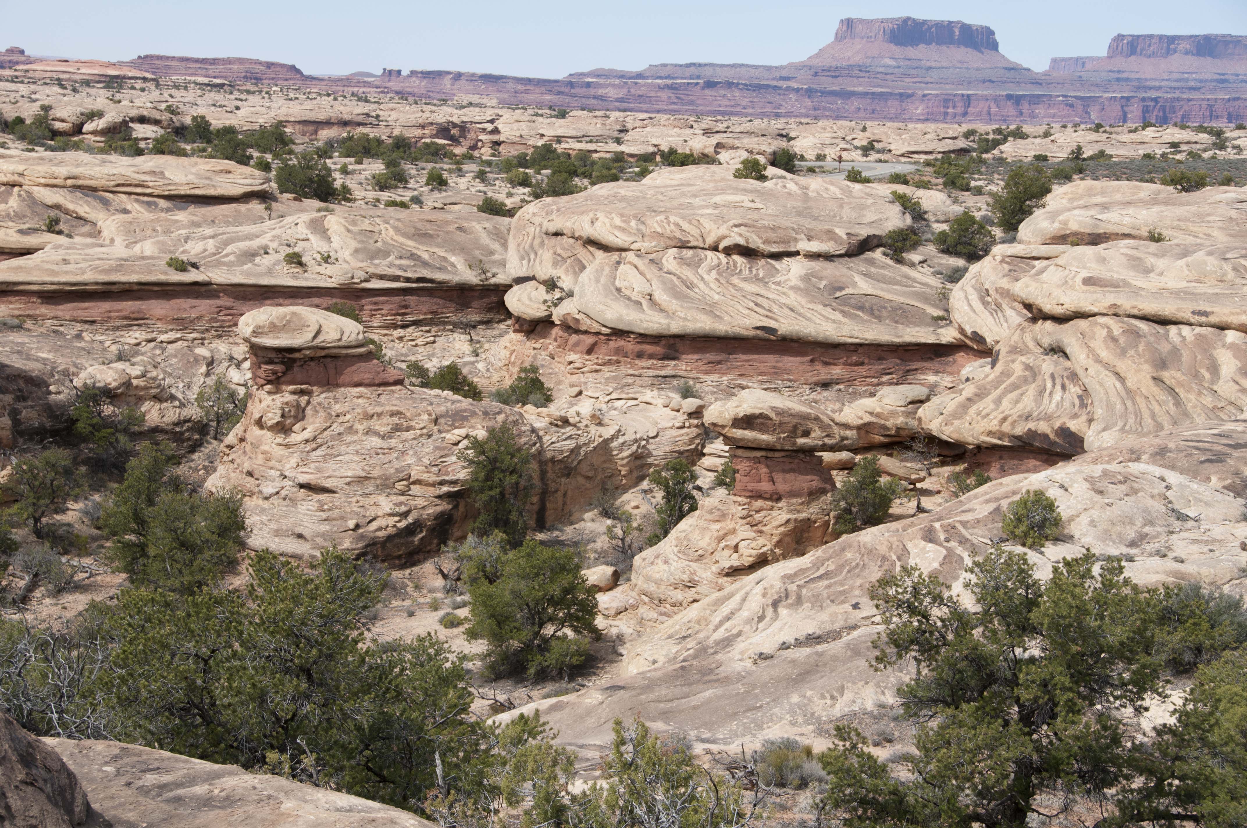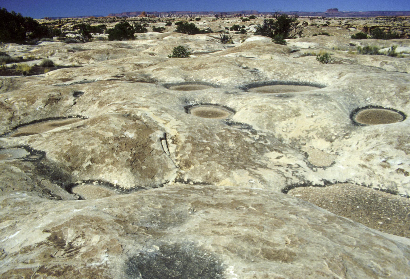 Pothole Point trail crosses slickrock containing numerous depressions