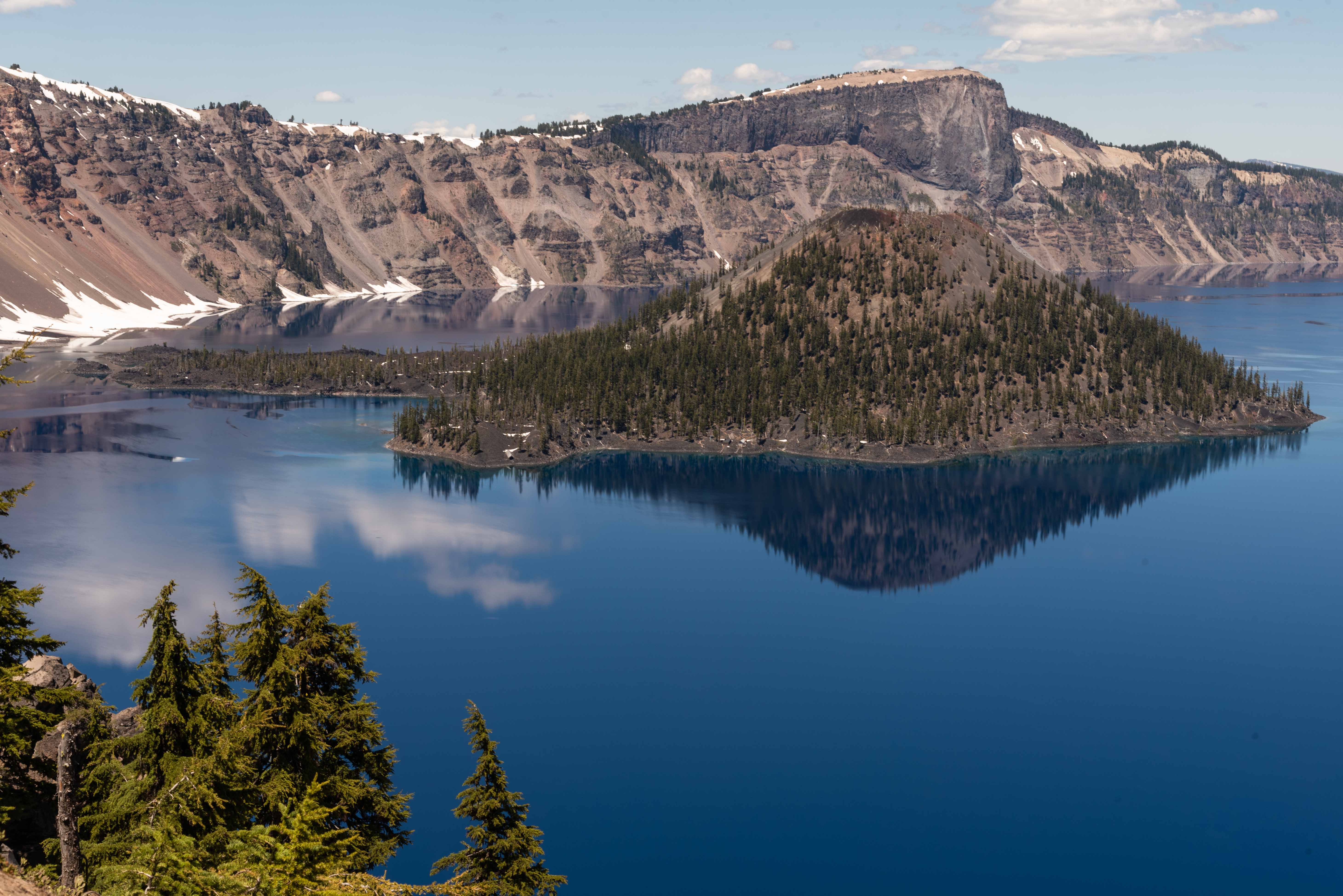 There are two islands in the lake, Wizard Island to the west and Phantom Ship to the southeast.