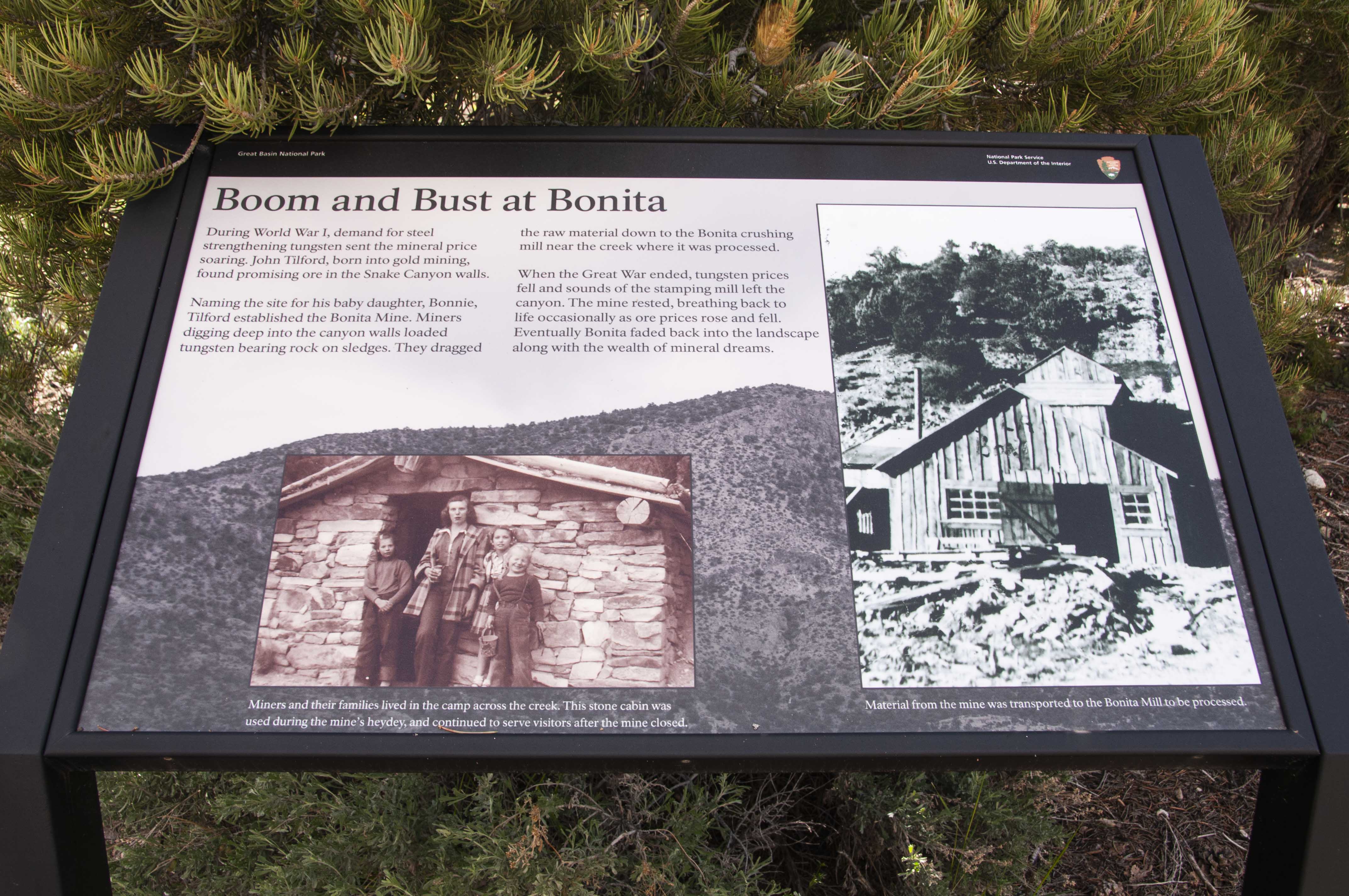 The advent of World War I produced sharp increases in the price of tungsten which was needed for the war effort. John Tilford found promising ore in Snake Canyon and started the Bonita tungsten mine. The mine became a family affair with about 40 miners and their families at its peak. The price of tungsten dropped at the end of the war and the mine was slowly abondoned over the next few years.