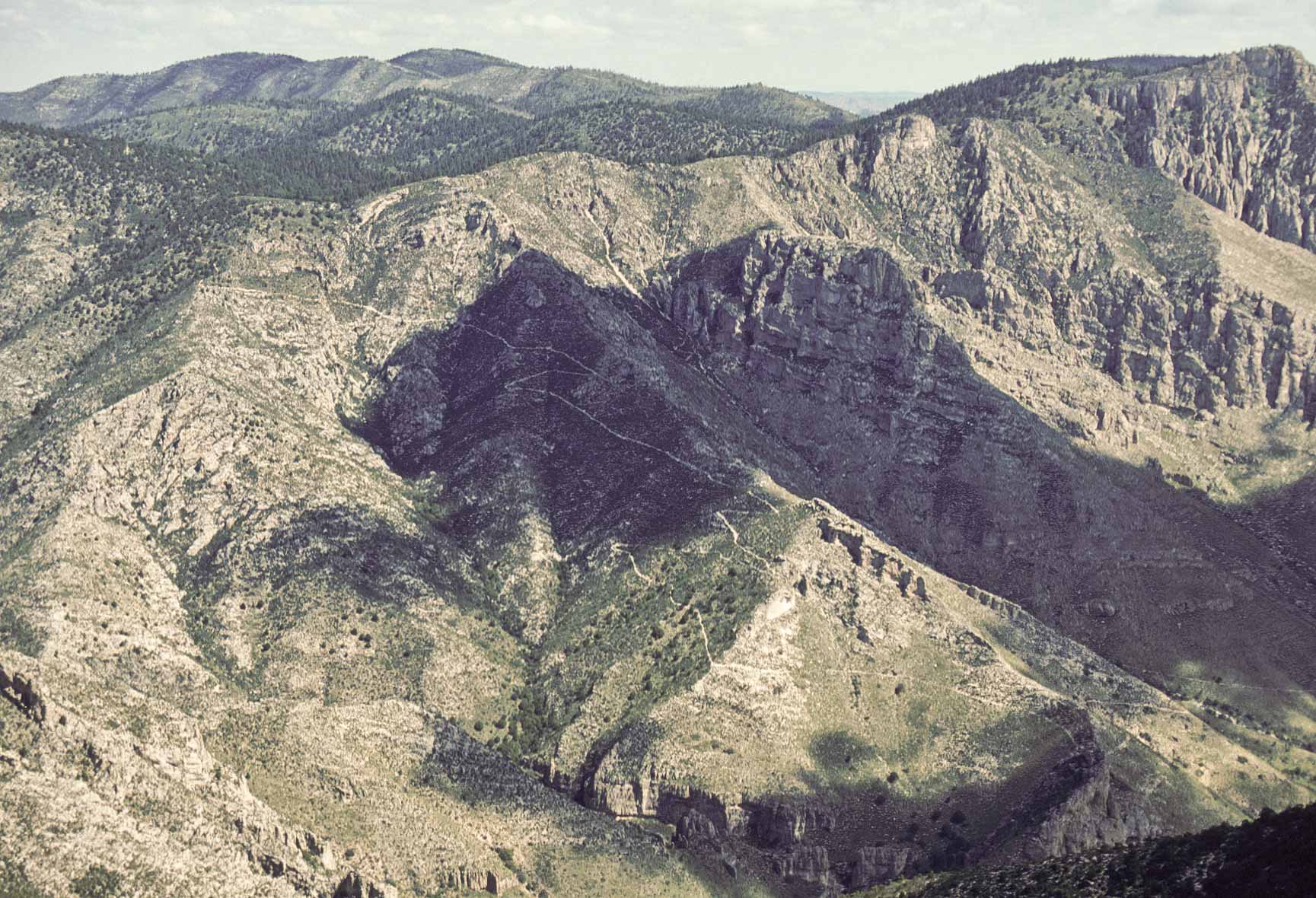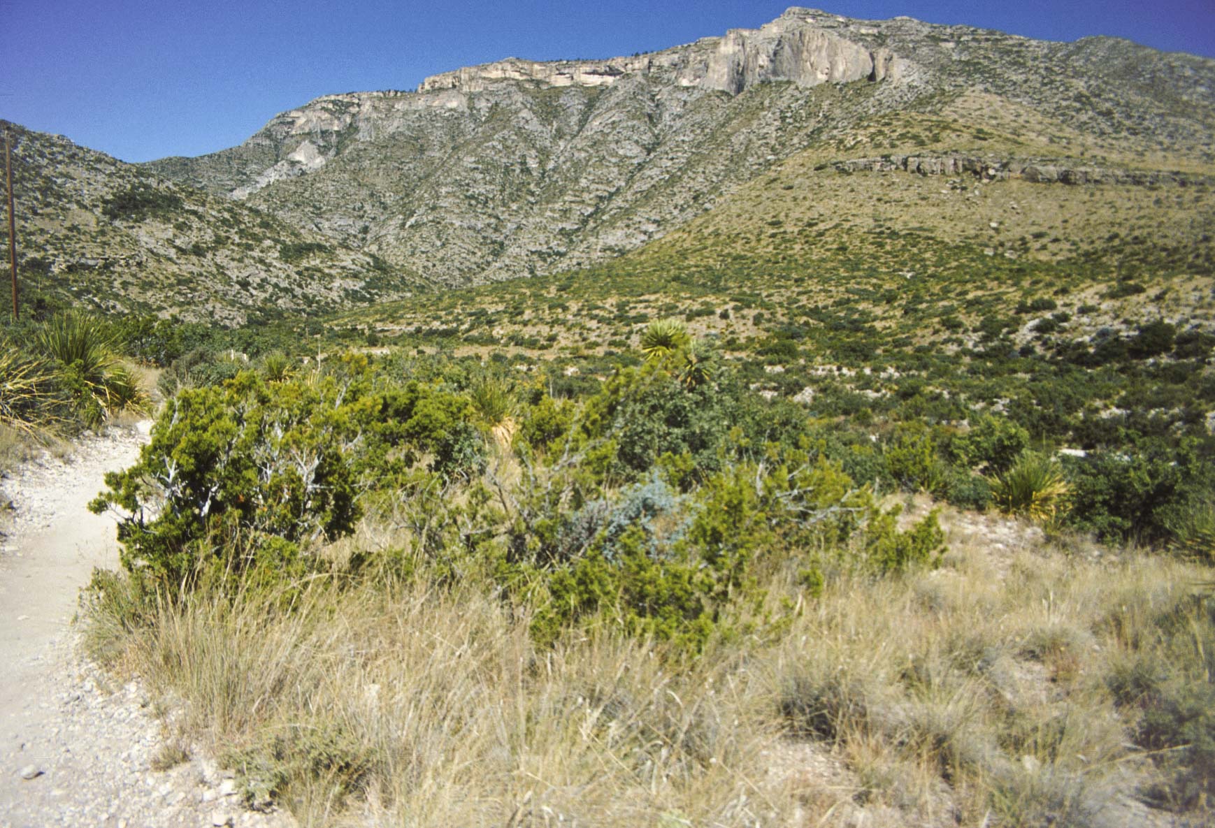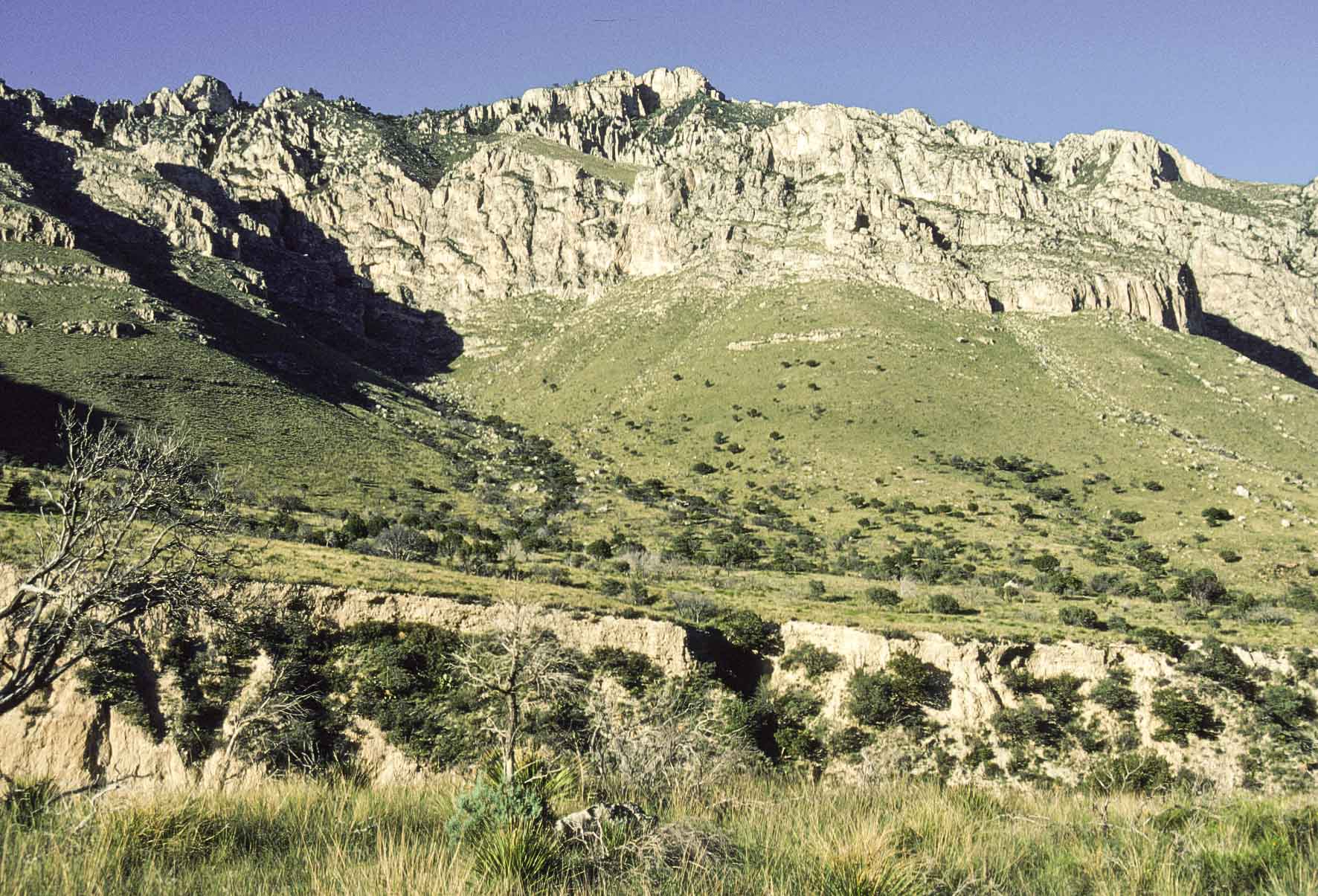 Guadalupe Mountains National Park is located on US Hwys 180/62 in West Texas along the Texas-New Mexico state line. The Park includes much of the Guadalupe Mountain range, which was once a reef at the edge of a shallow Permian sea. Guadalupe Mountains National Park is a hikers park, with some 80 miles of trails. Day hikes will take you through different climate zones, from a Chihuahuan desert environment to high country forests. The pictures presented here are from trips to the park in 1989, 1992, and 1998.