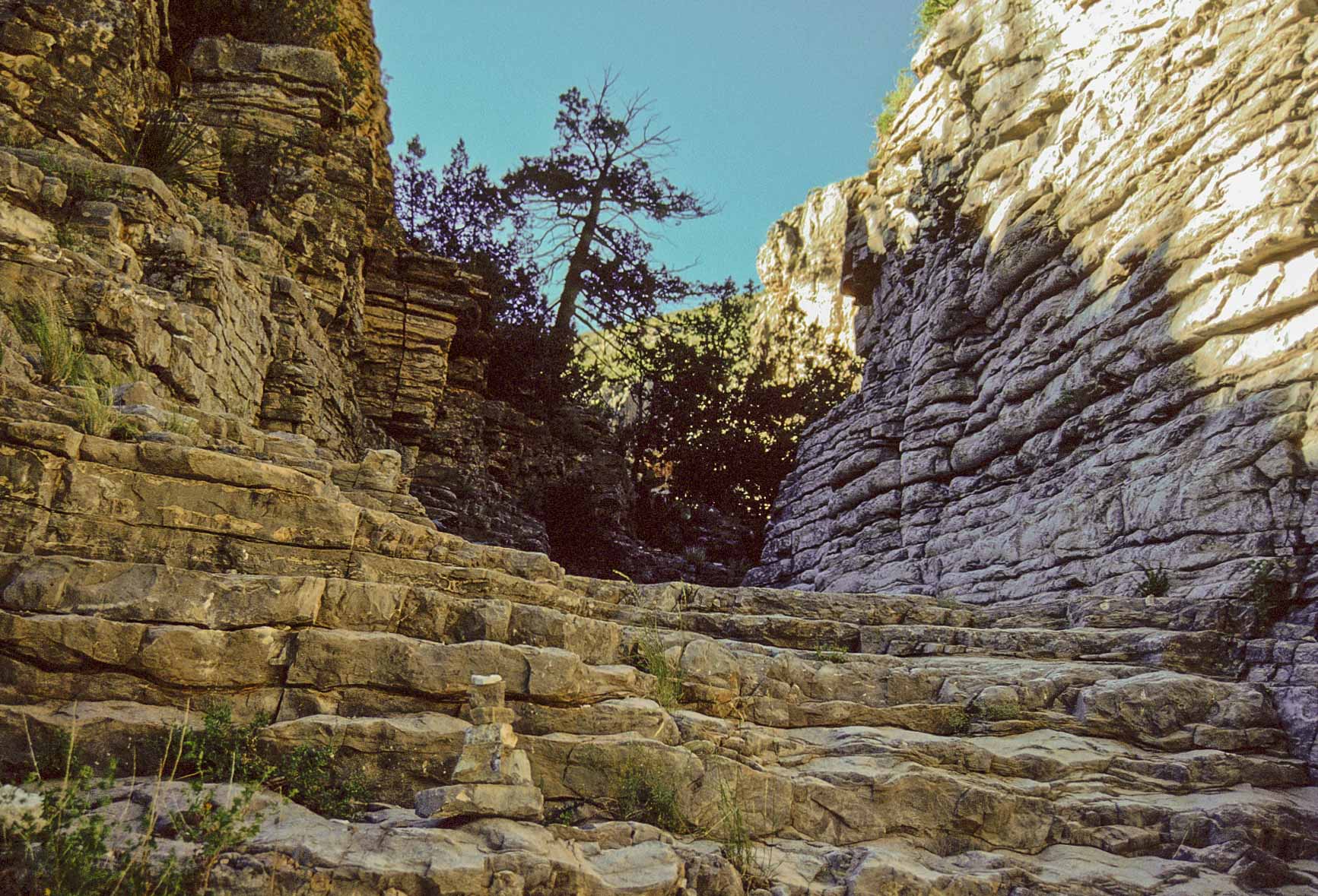 in Pine Springs Canyon. Fianlly it climbs the Hiker's Staircase to the Devil's Hall