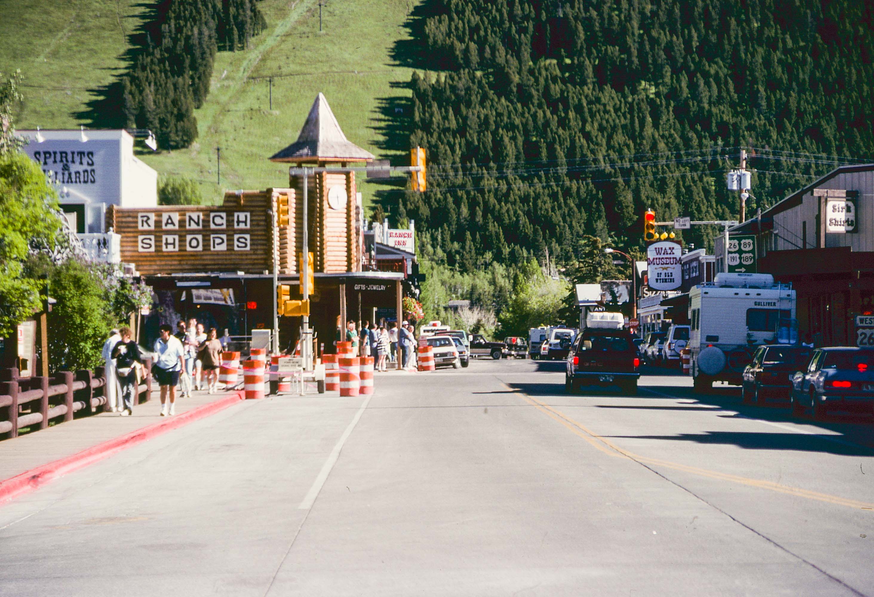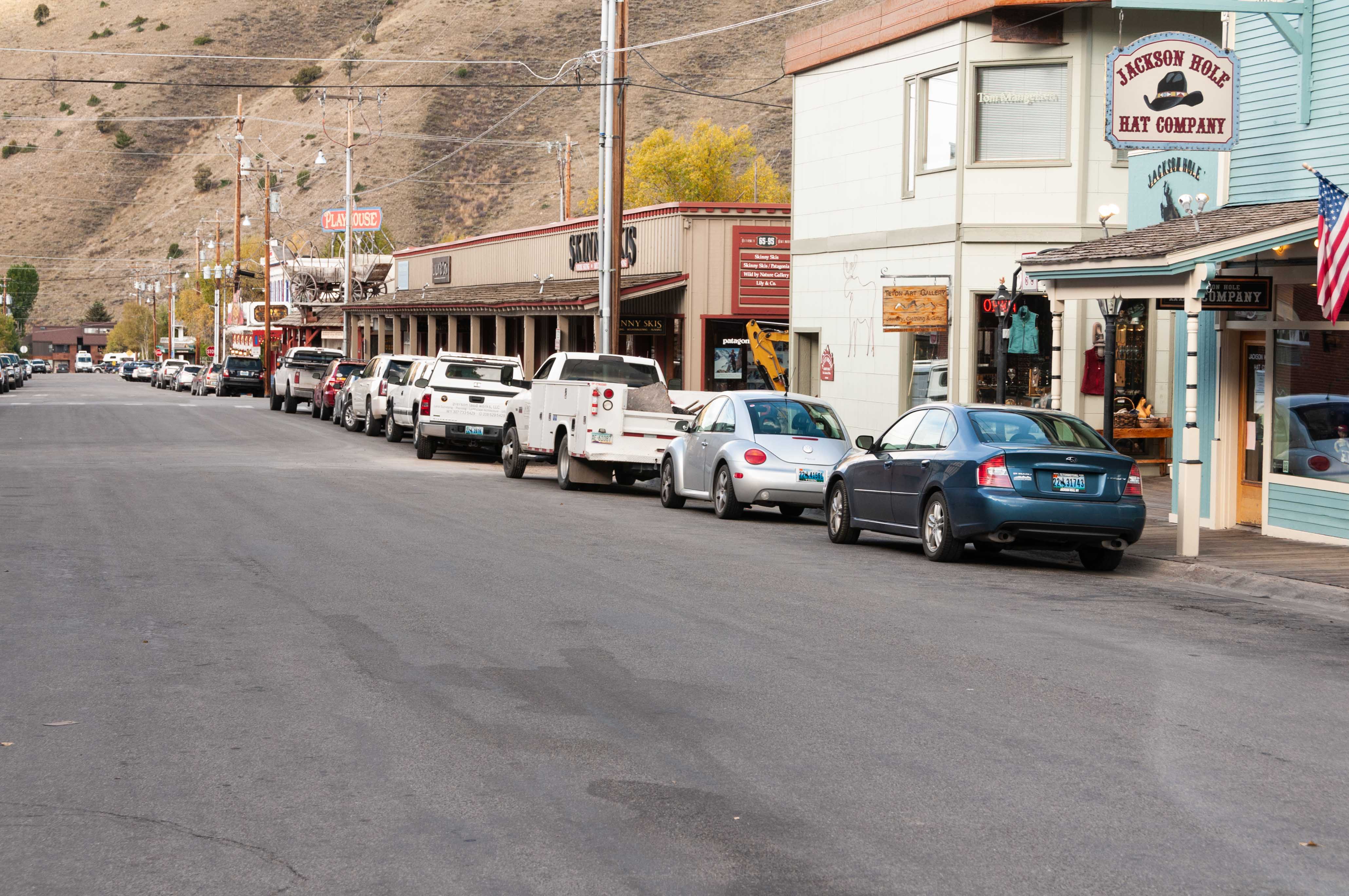 West Deloney Avenue is pictured in the photo to the right, taken in Oct 2014. Skinny Skis Sporting Goods is shown in the center of the picture and Jackson Hole Hat Company is to the right. The hat company closed some time after this photo was taken.