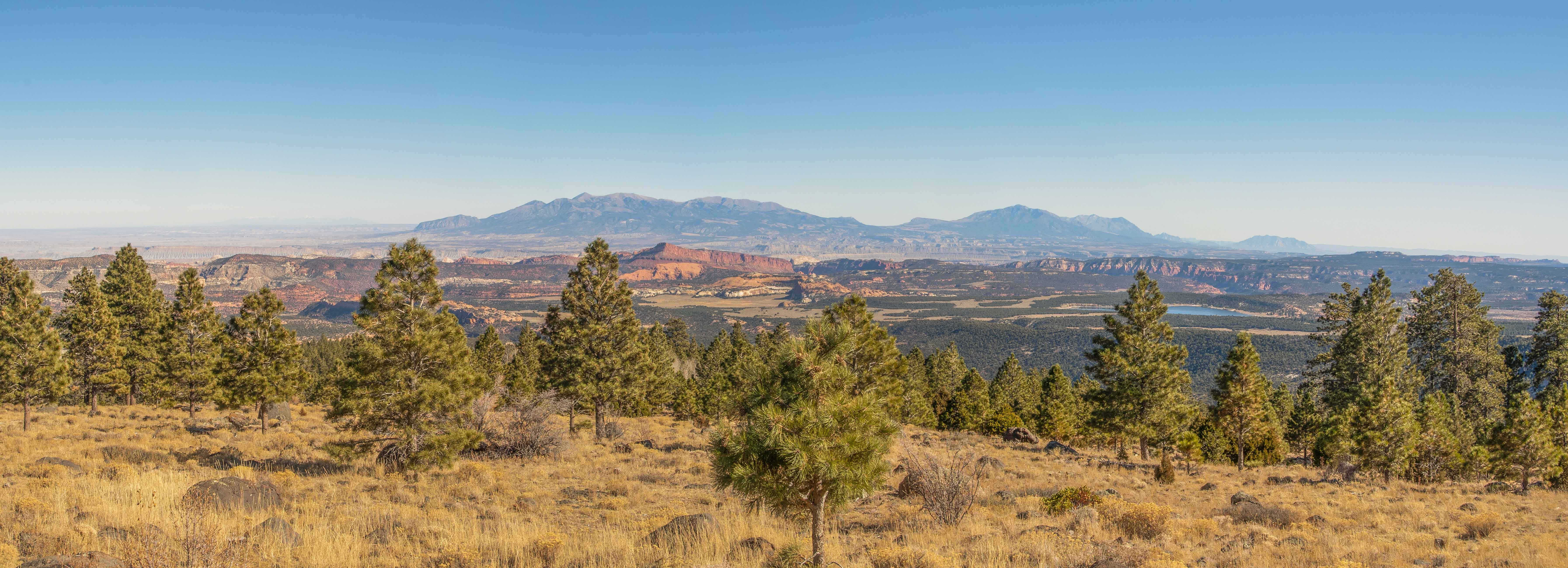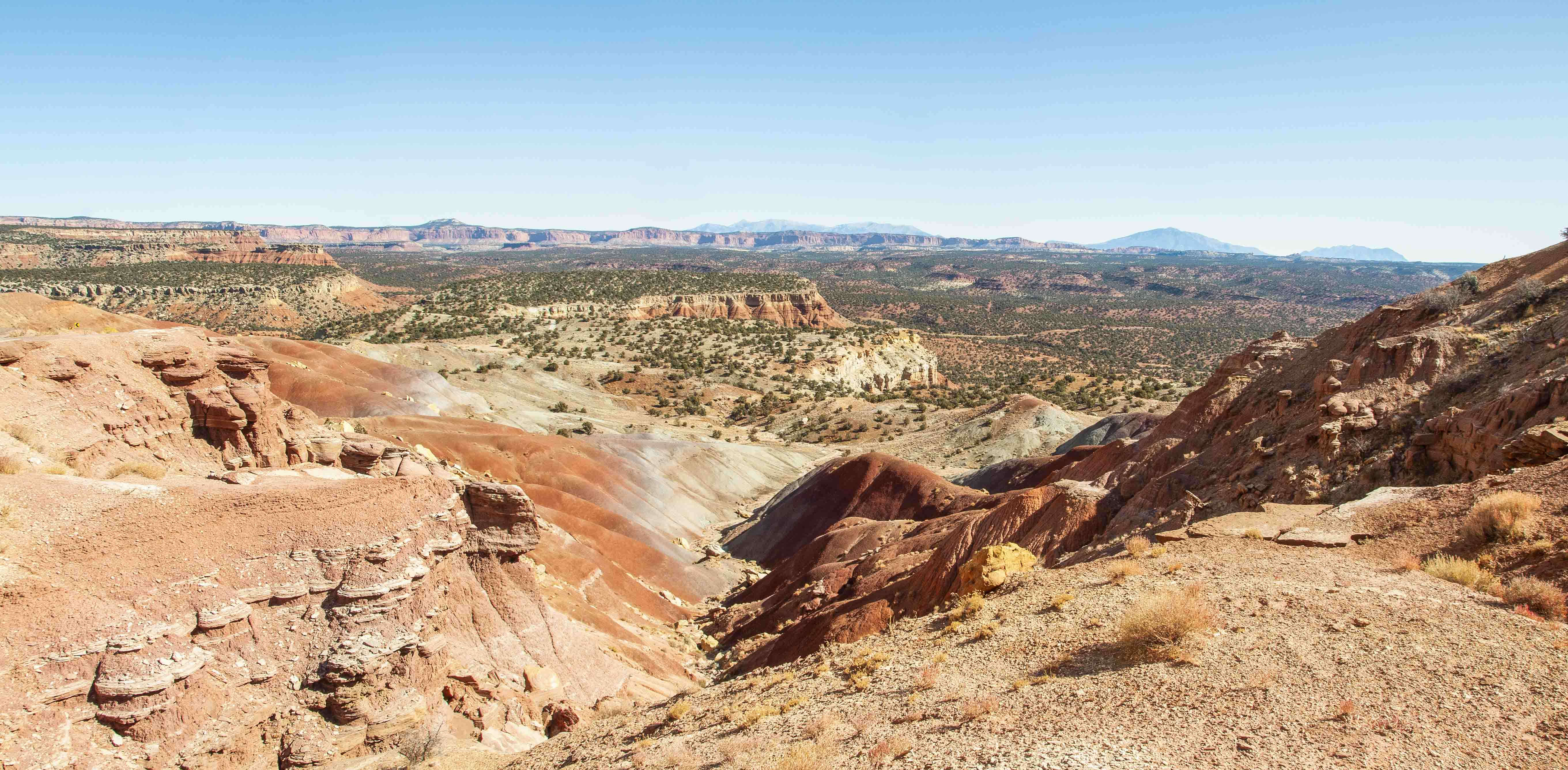 view from here includes the multi-colored hills of the Chinle Formation, the Circle Cliffs, and the