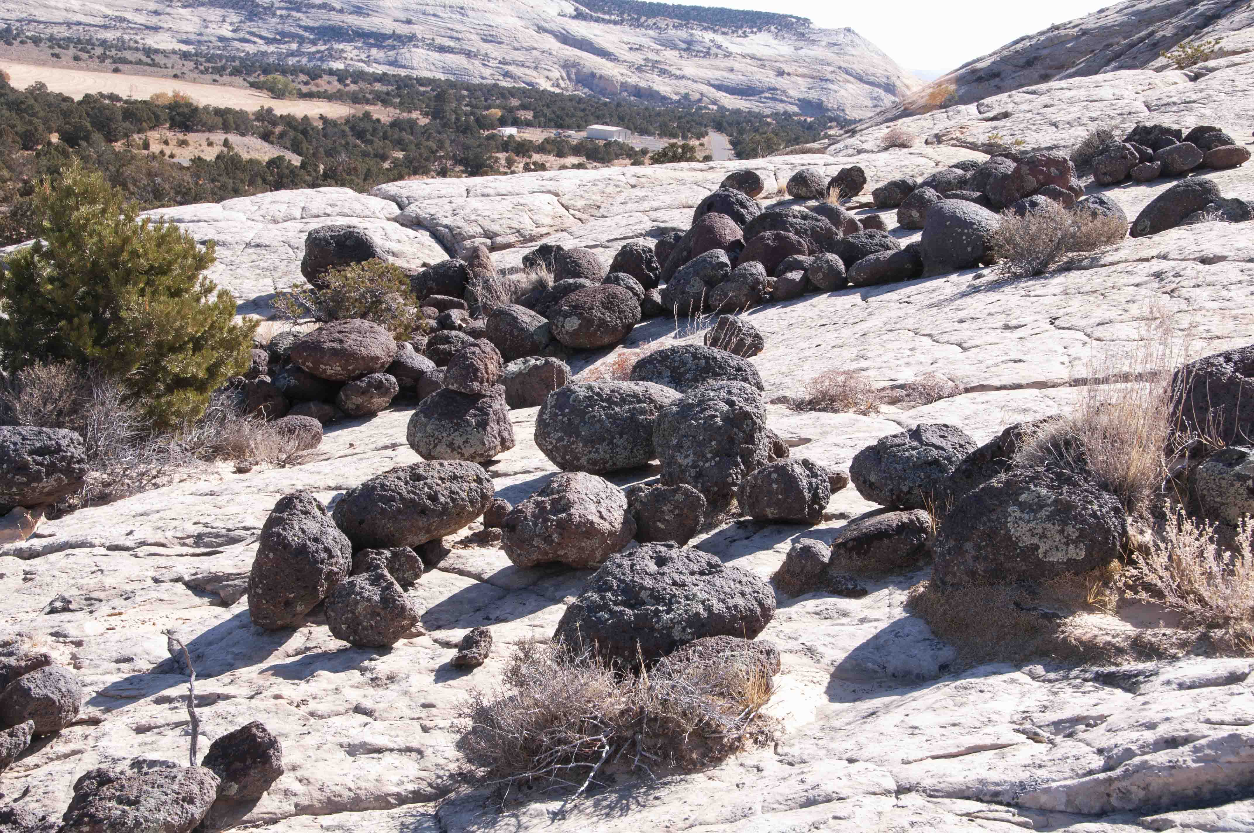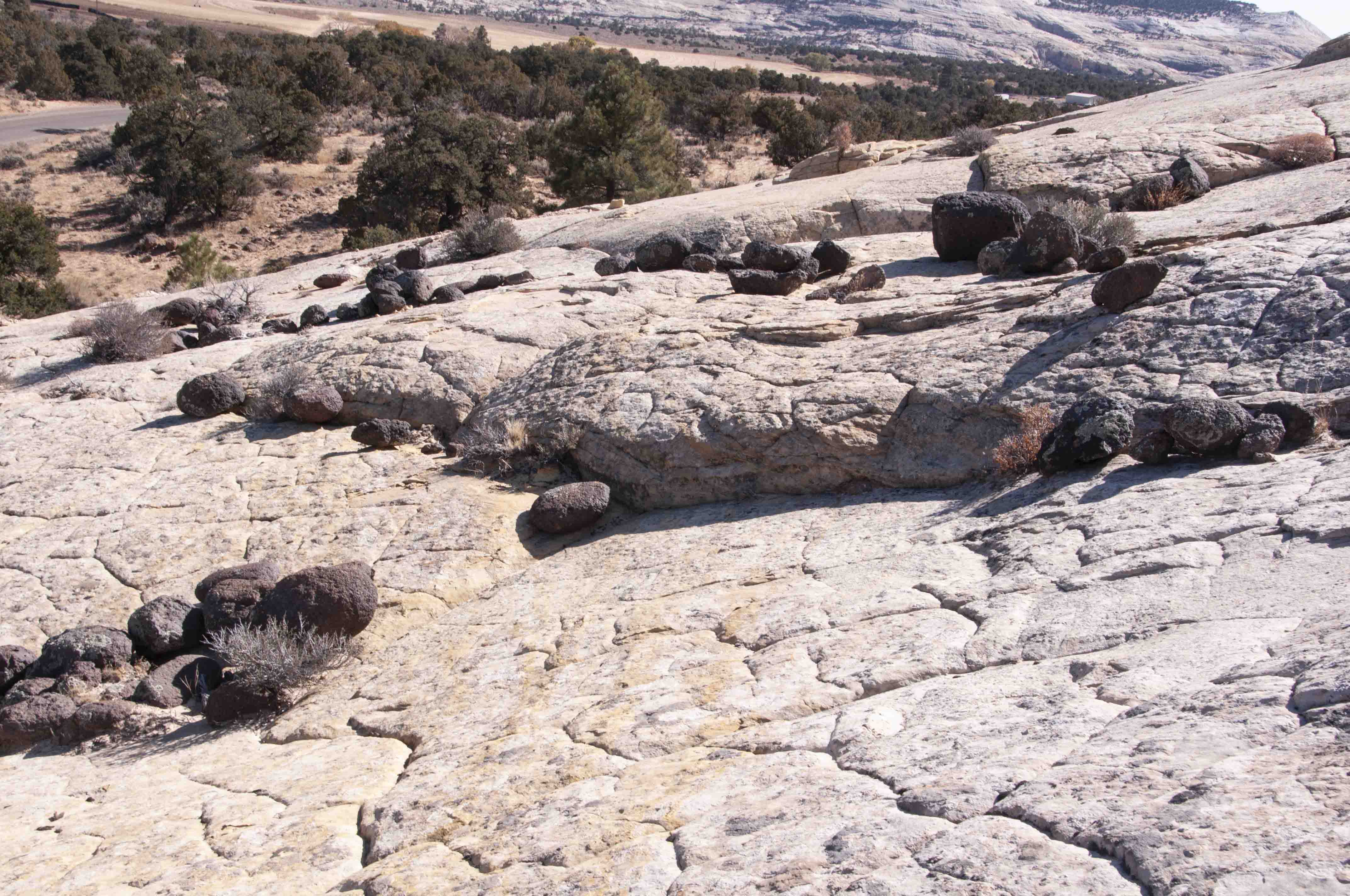 expanses of fractured Navajo Sandstone dotted with rounded boulders of