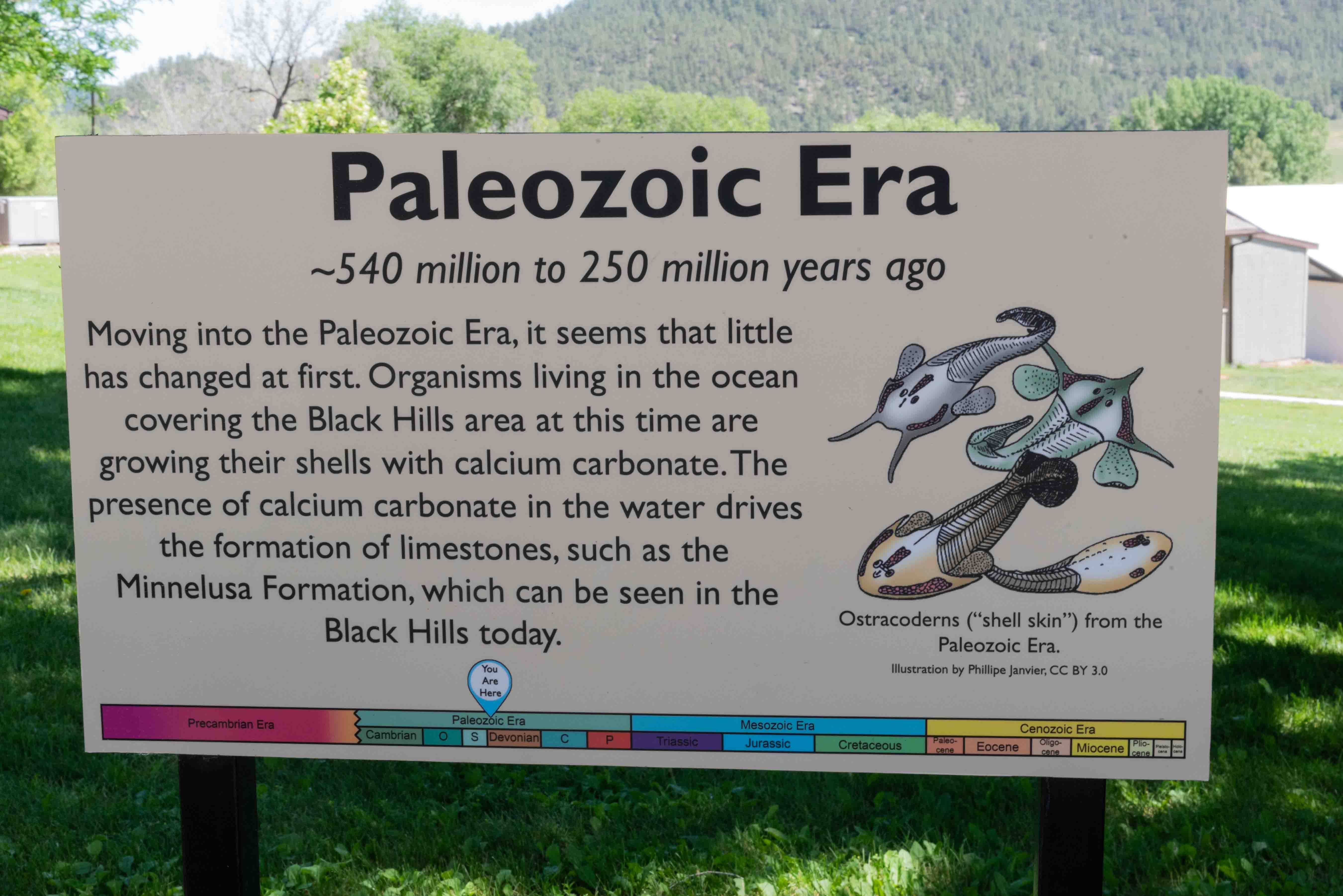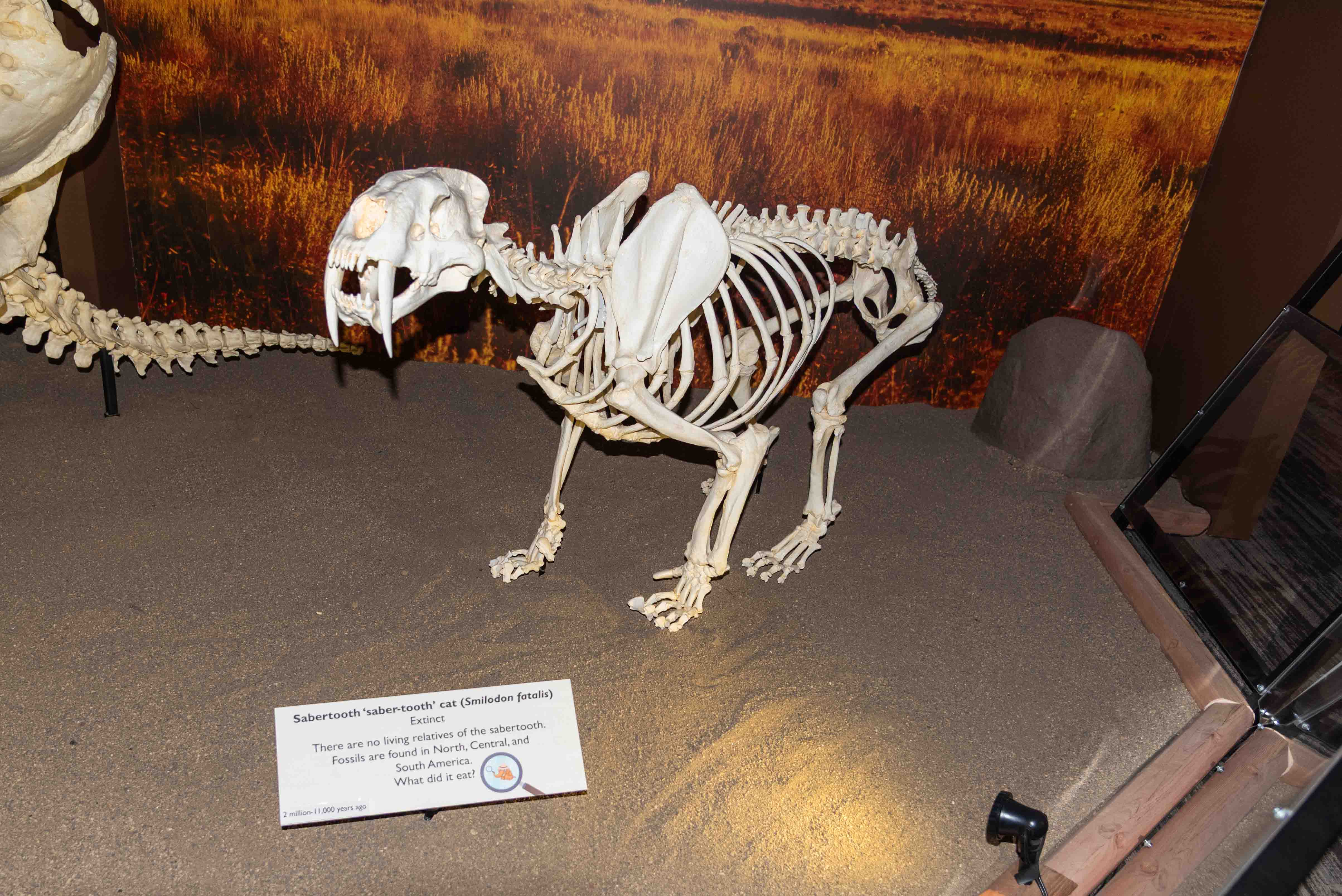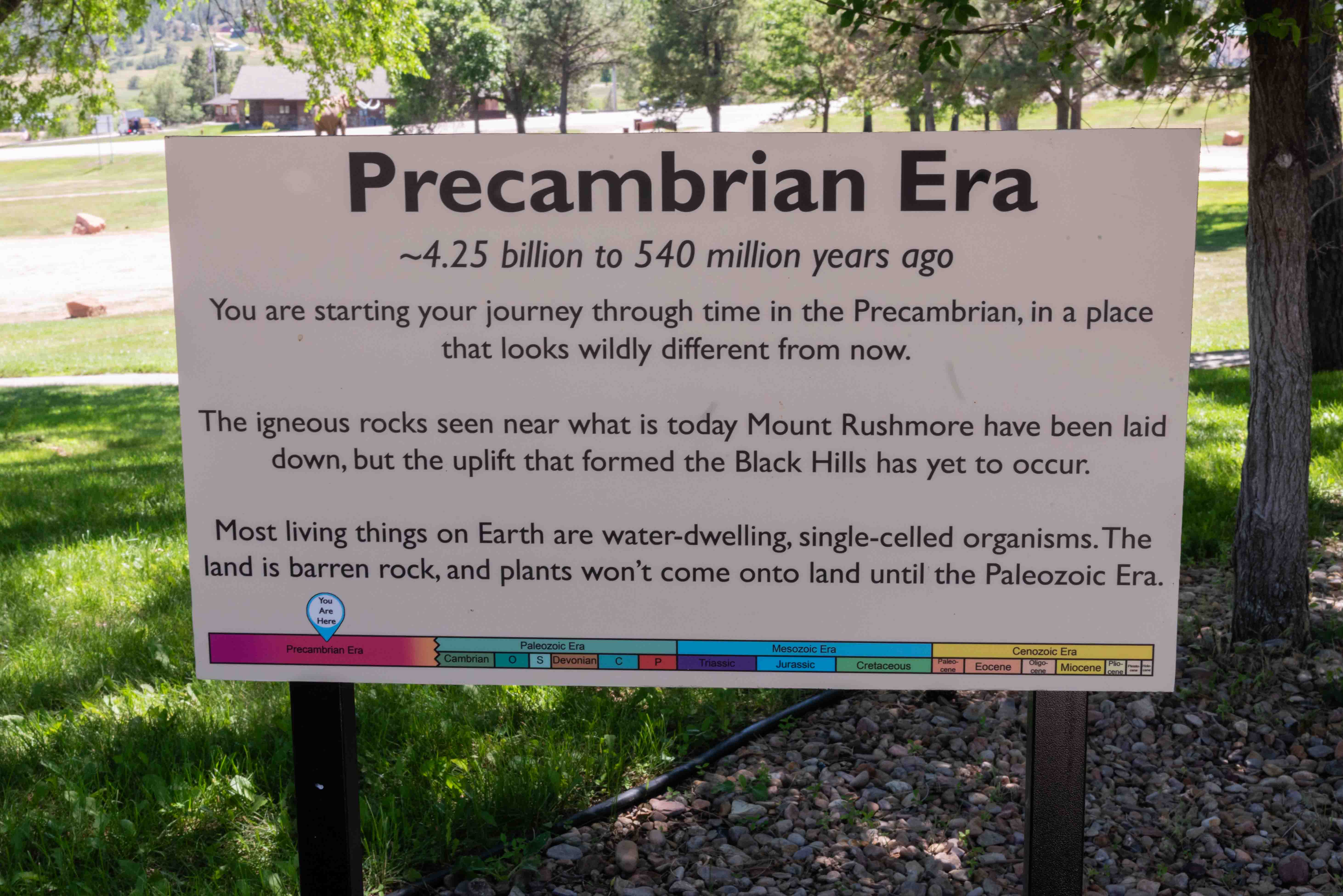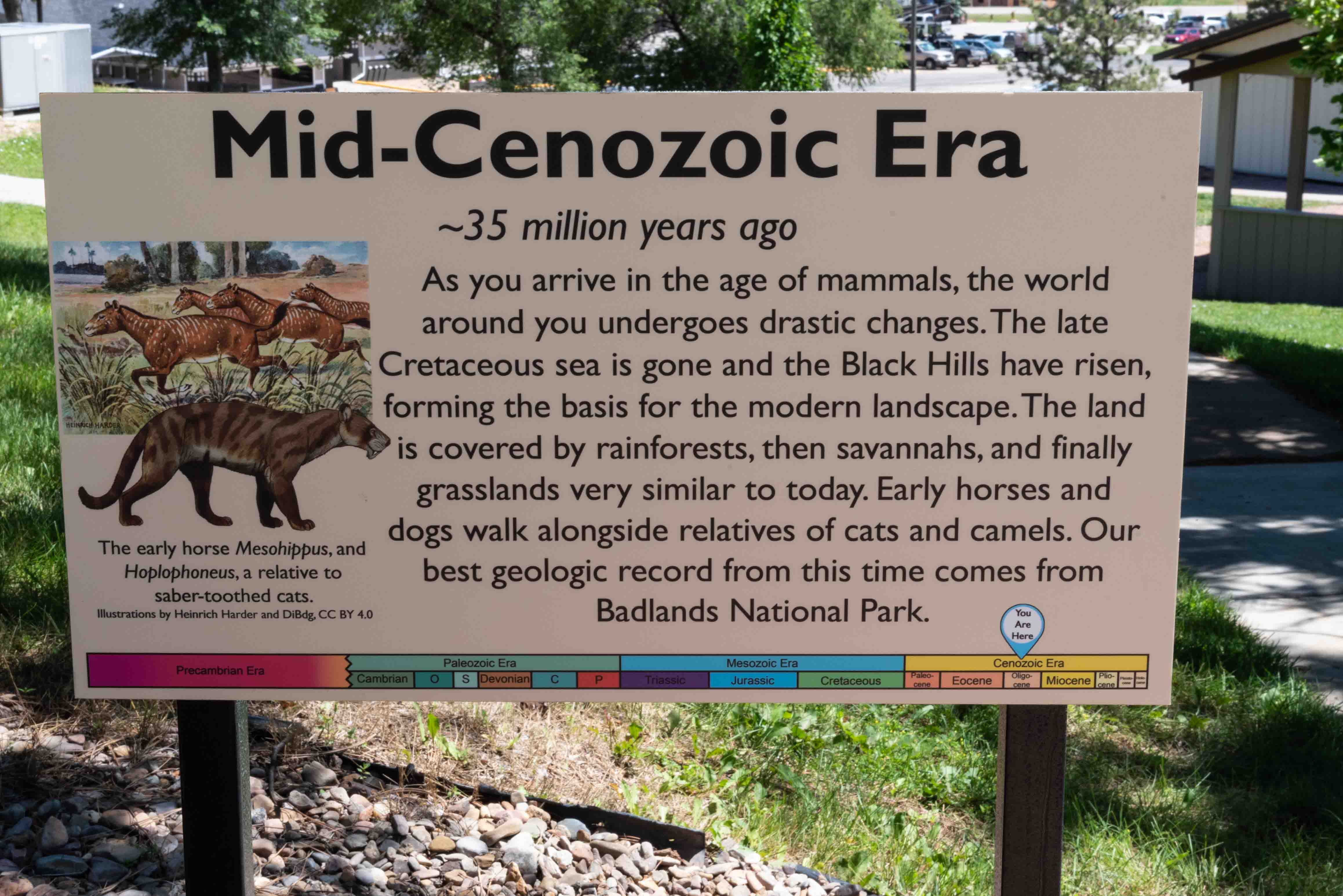There are signs along the sidewalk from the parking lot to the museum describing the various time periods in Earth's history. The earliest time is near the parking lot. This is the Precambrian Era, 4.25 billion to 540 million years ago. Once you get to the building you've traveled in time all the way up to the Pleistocene Epoch of the Cenozoic Era, some 2.5 million years ago.