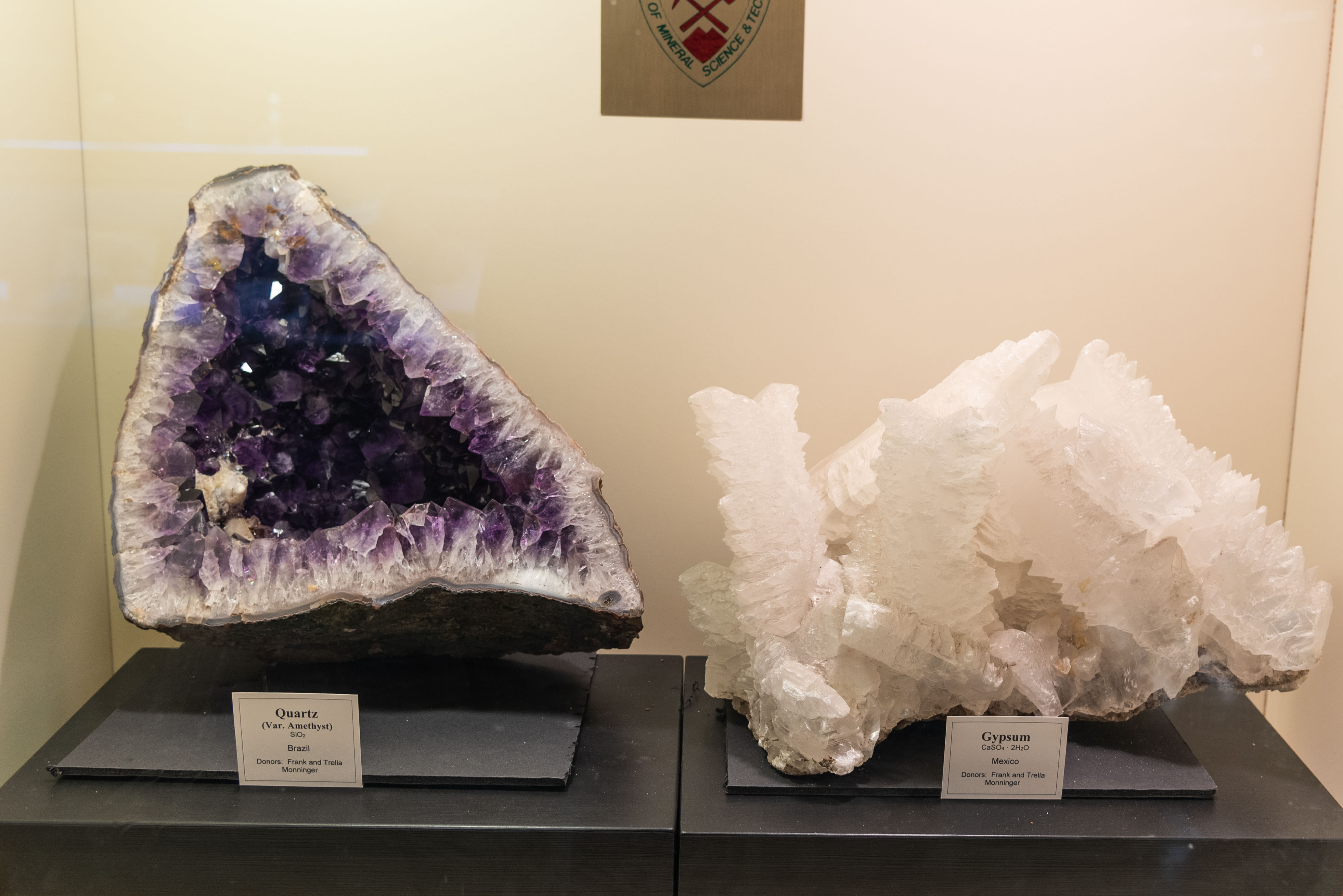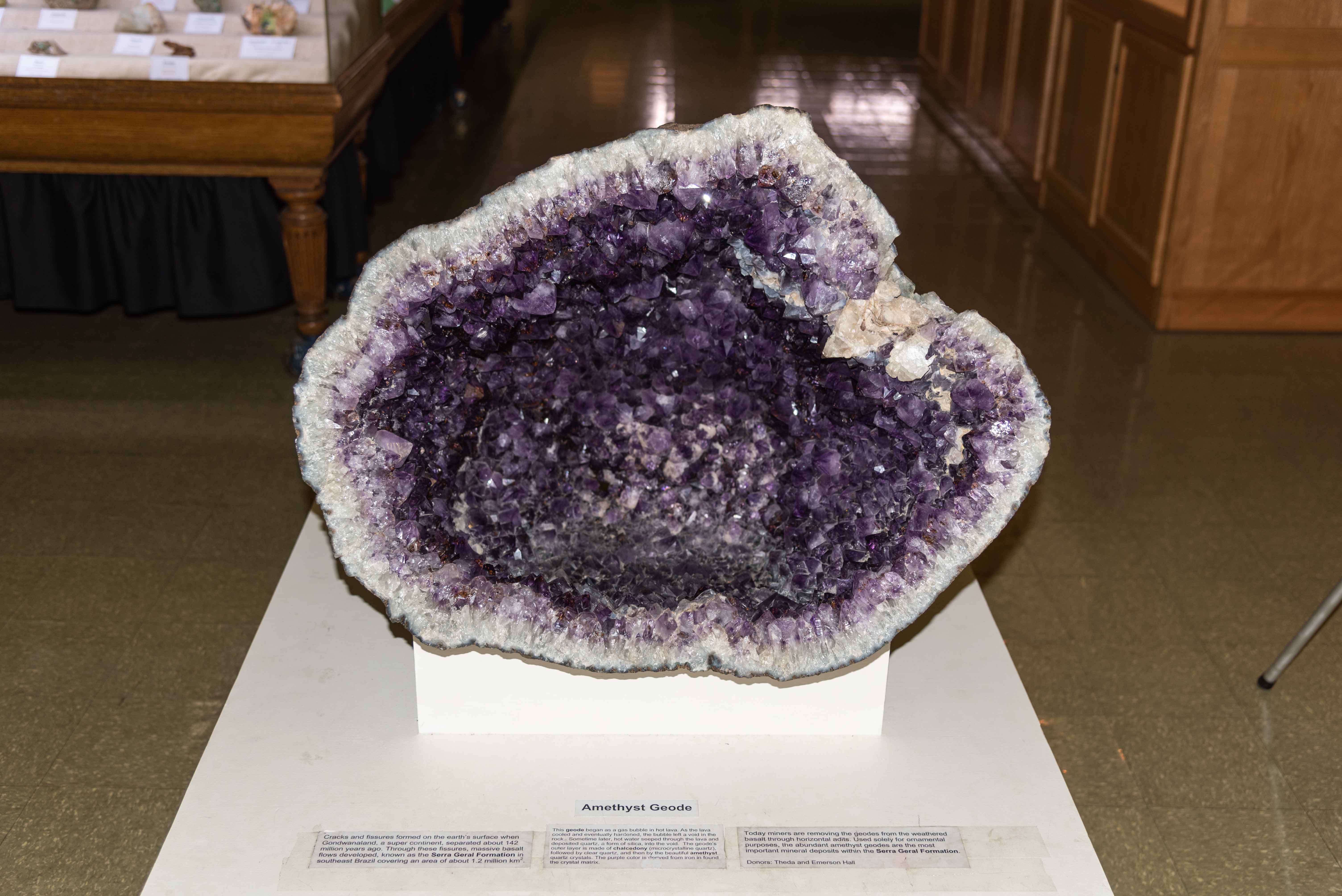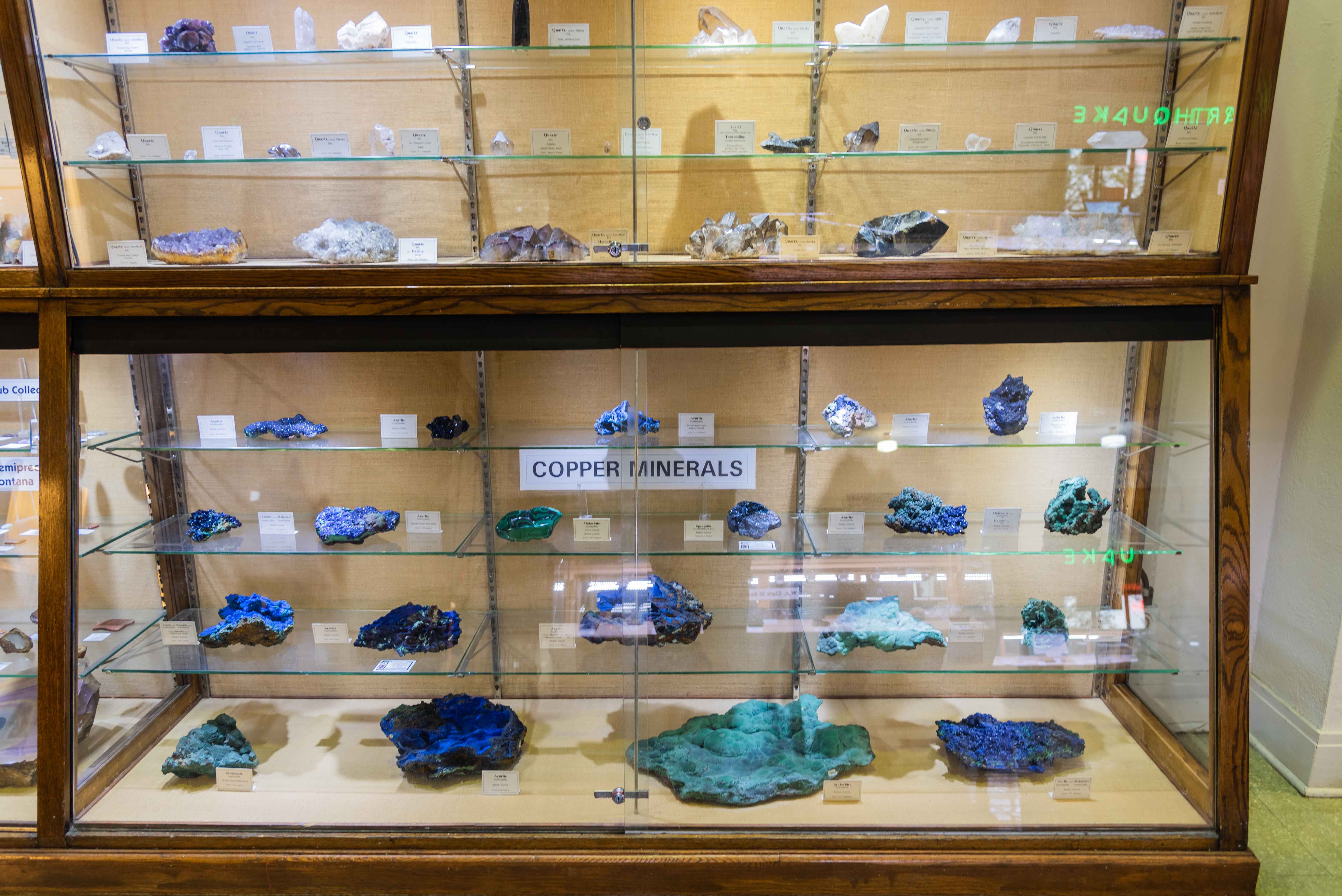 azurite and malachite from Bisbee in Arizona, native copper from Michigan, and amethyst geodes from Brazil.