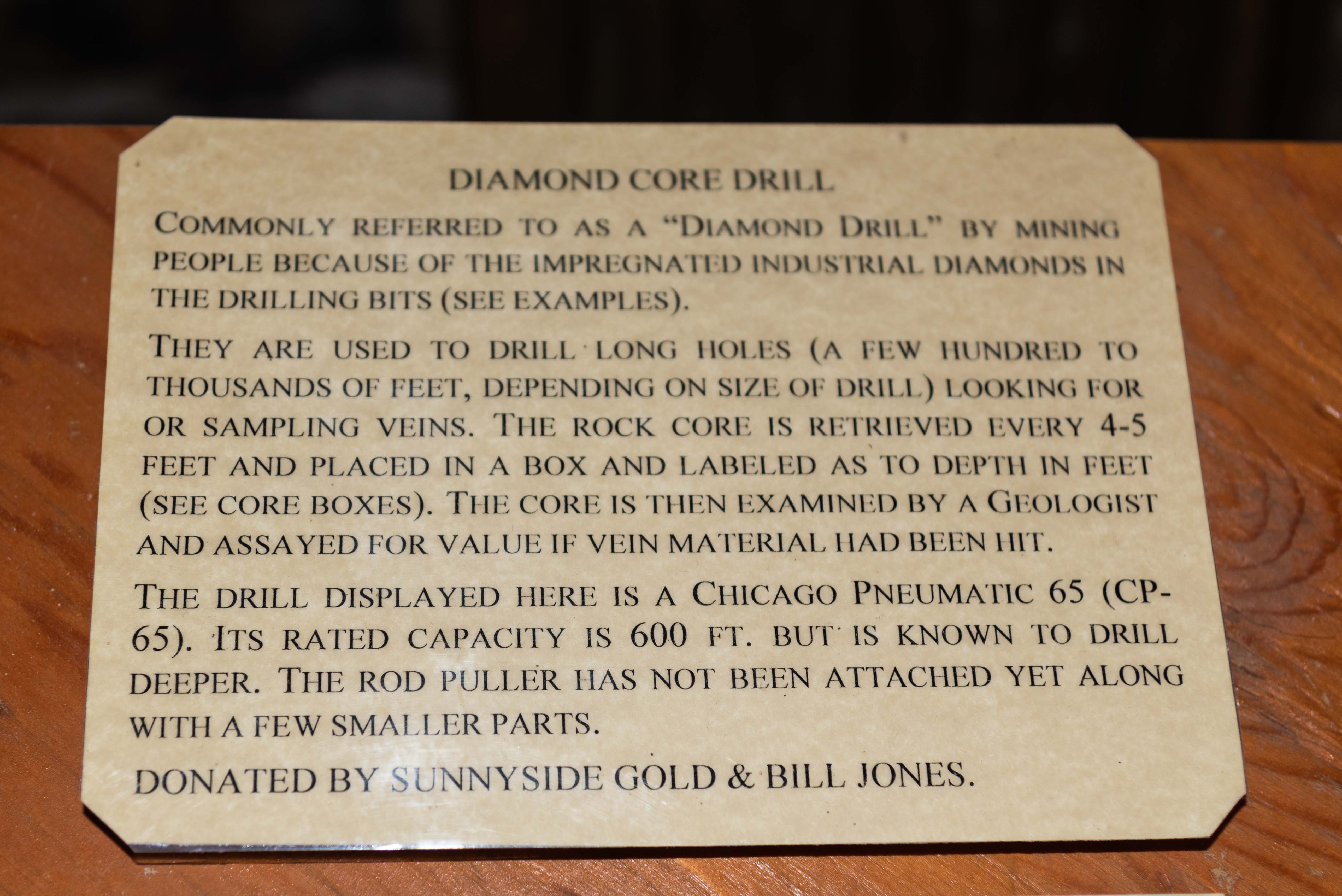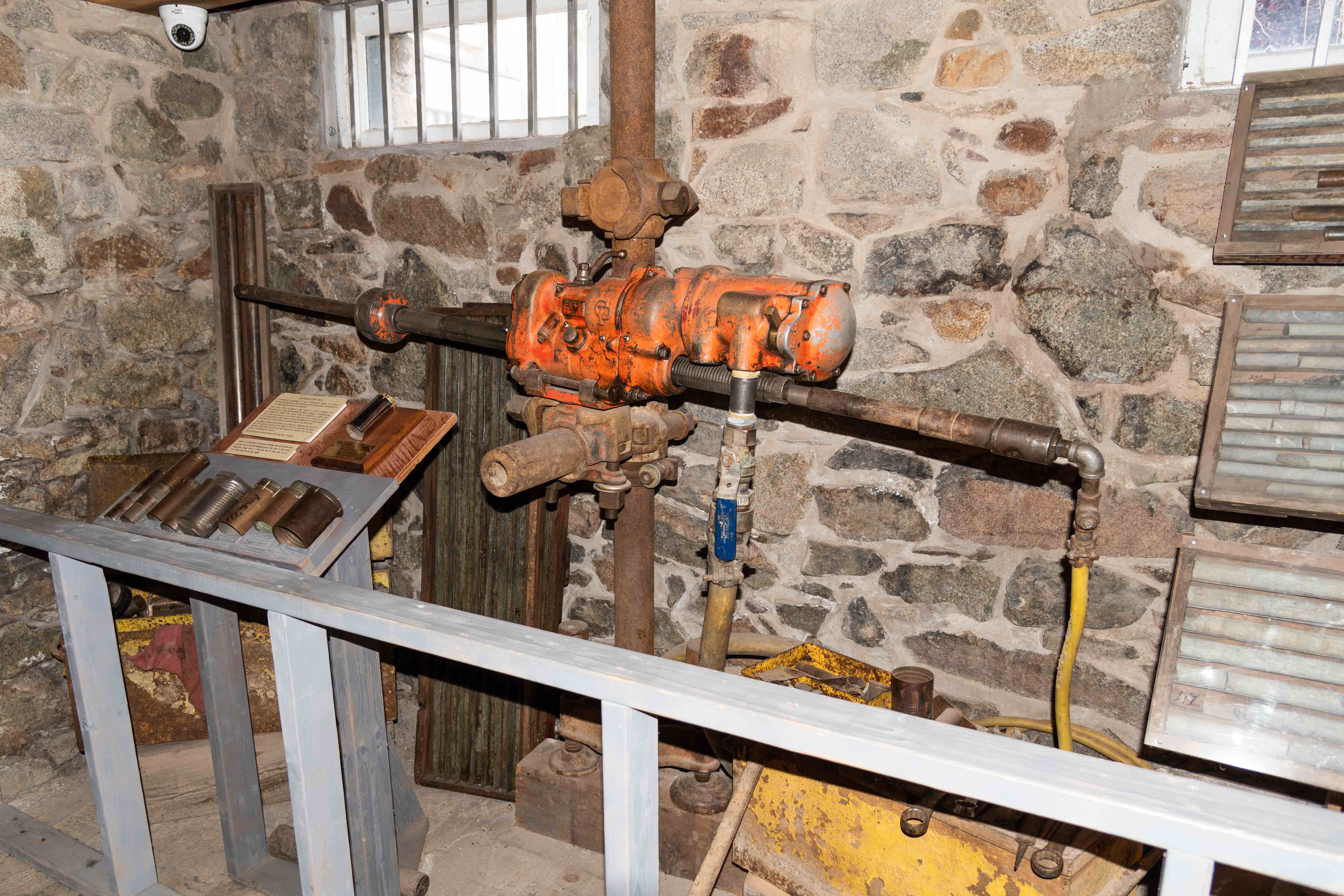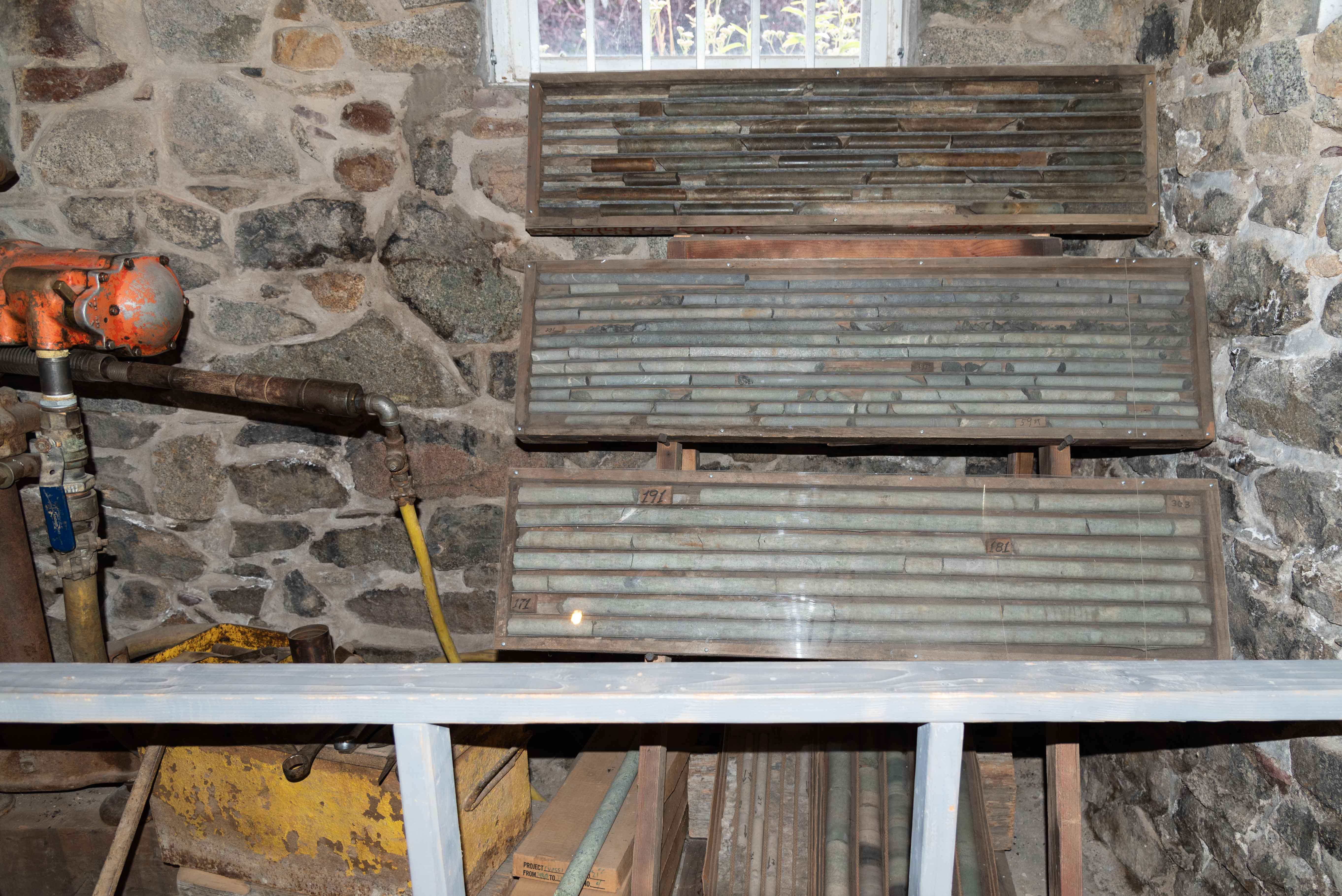 Diamond Core Drill - Core drills were used to probe known ore deposits or search for new ones. Cores from a few hundred to several thousand feet were drilled. The core samples were recovered and examined by geologists to determine whether to begin, continue, or abandon a mine. Prior to the availability of diamond core drills, most mineral prospecting consisted of finding surface outcrops or hand digging.