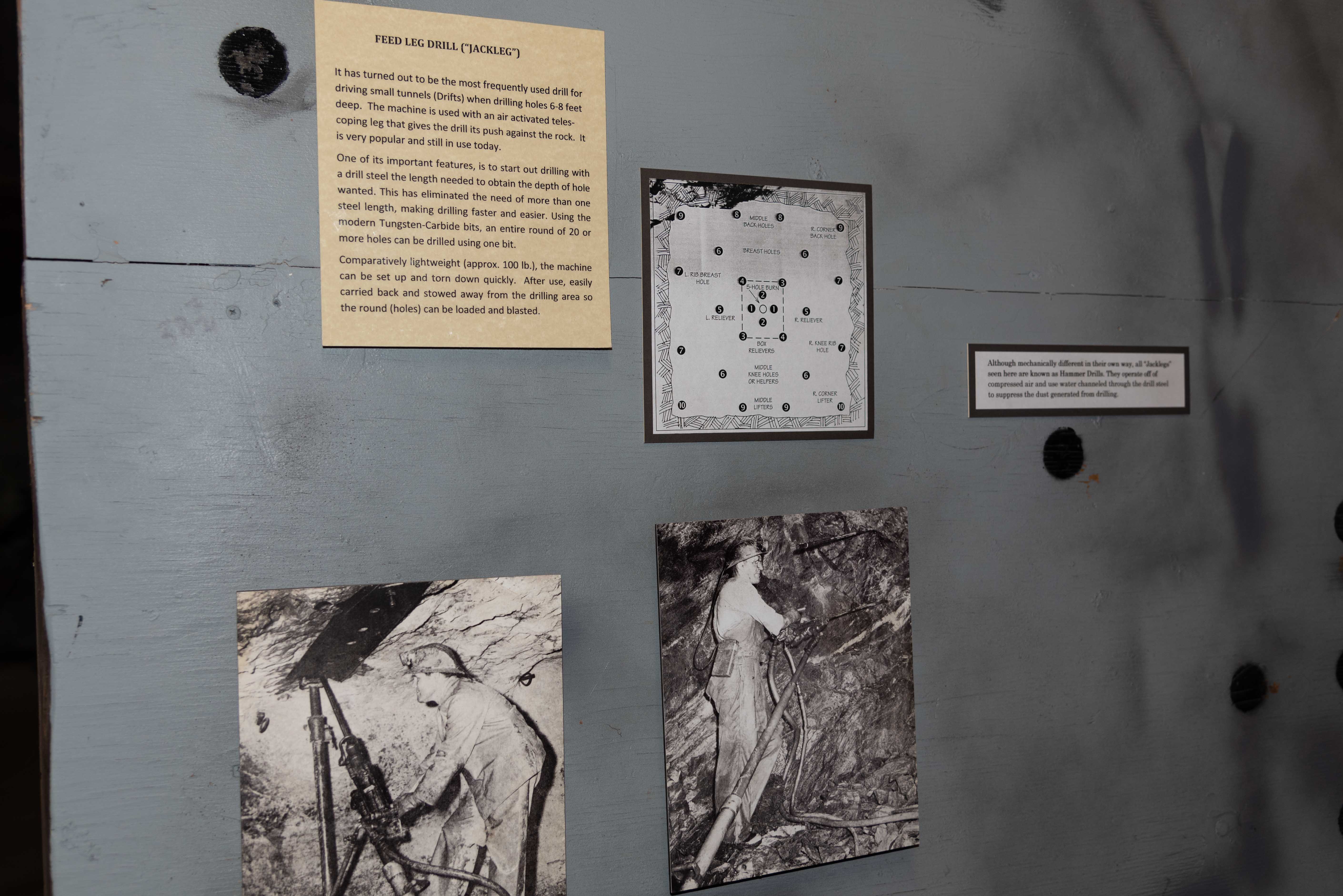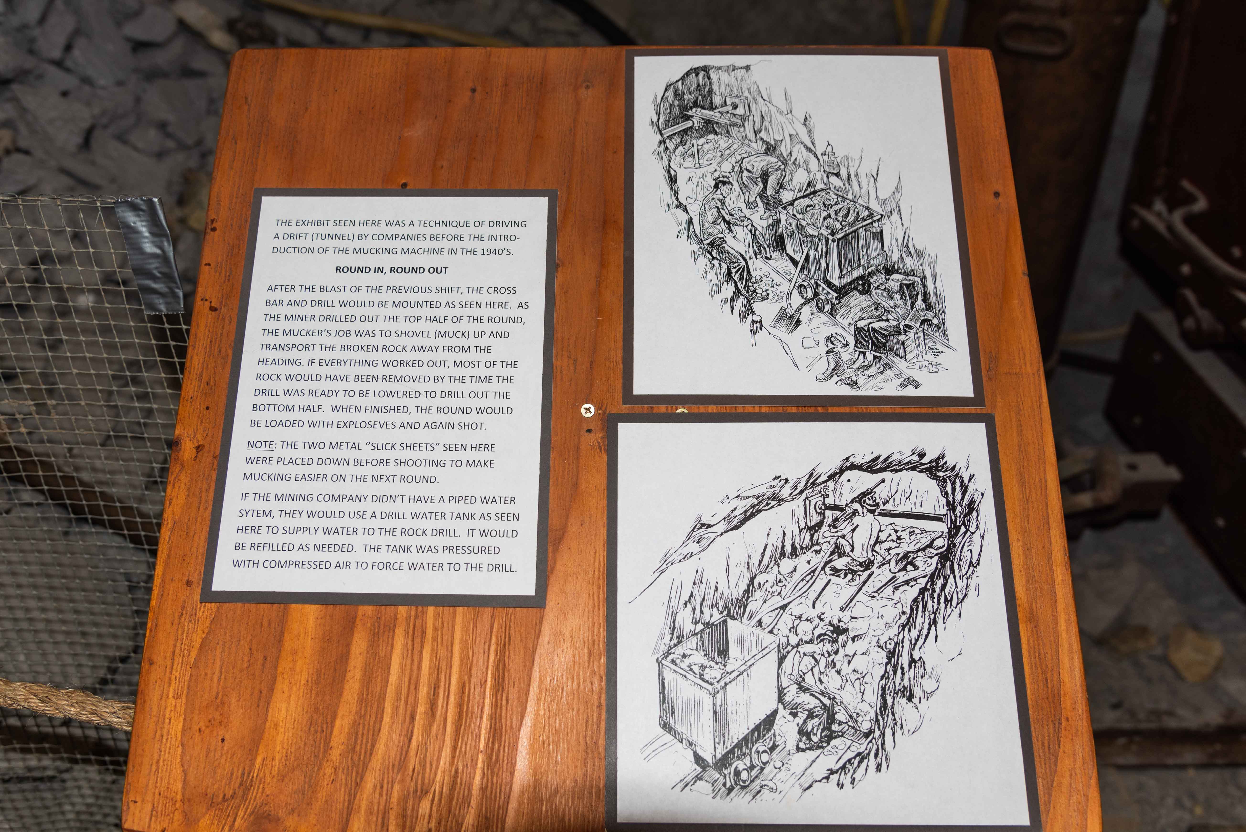 Holes were drilled in a specific pattern in the face of a drift or stope. Dynamite was inserted into the holes and fired to break up the rock and advance the drift. The blasted ore and waste rock was loaded into carts for removal to the surface. This process was called "mucking" and was done manually by human muckers or by mucking machines.