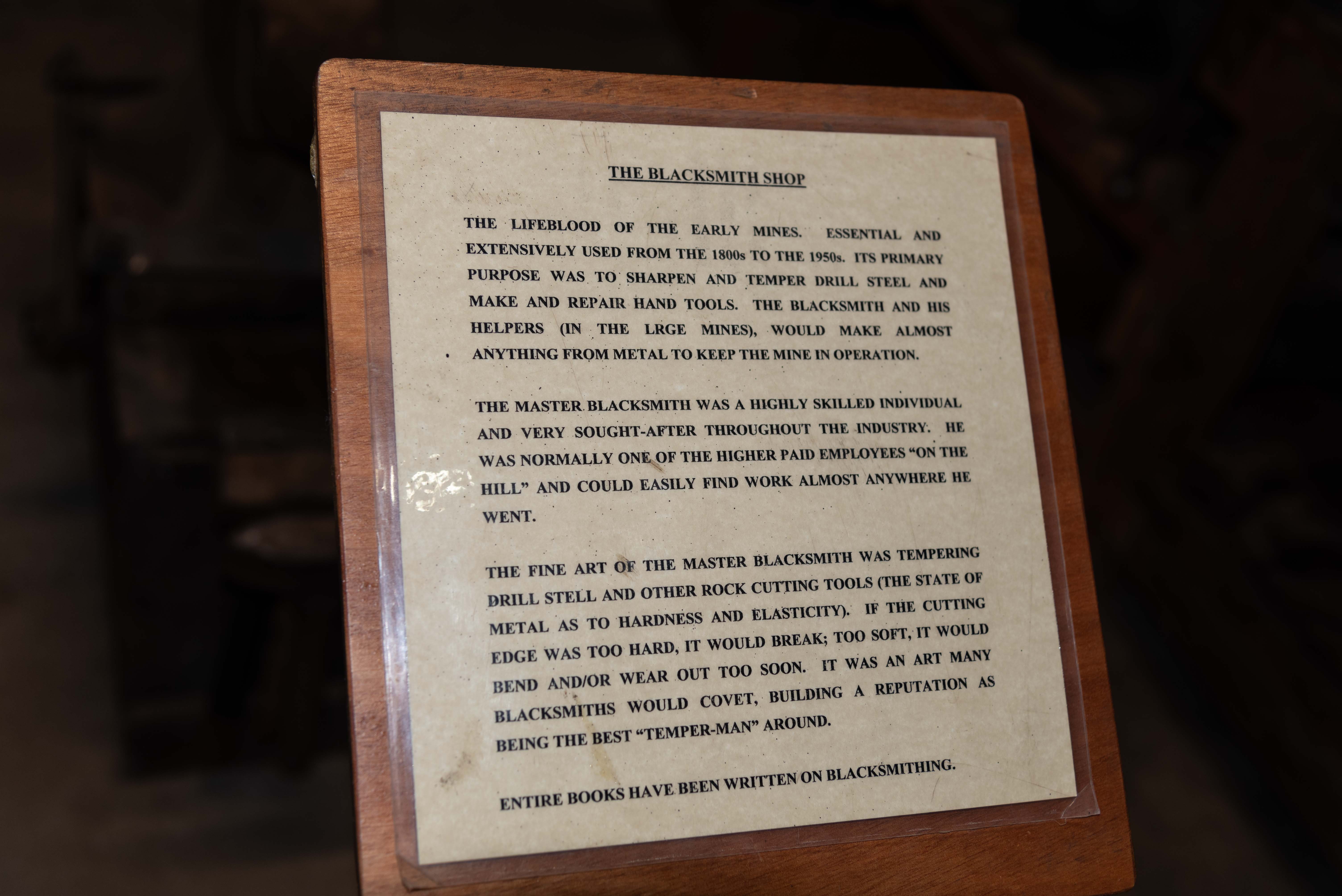 the timbers that supported the stopes and drifts. Blacksmiths sharpened drill steel and repaired