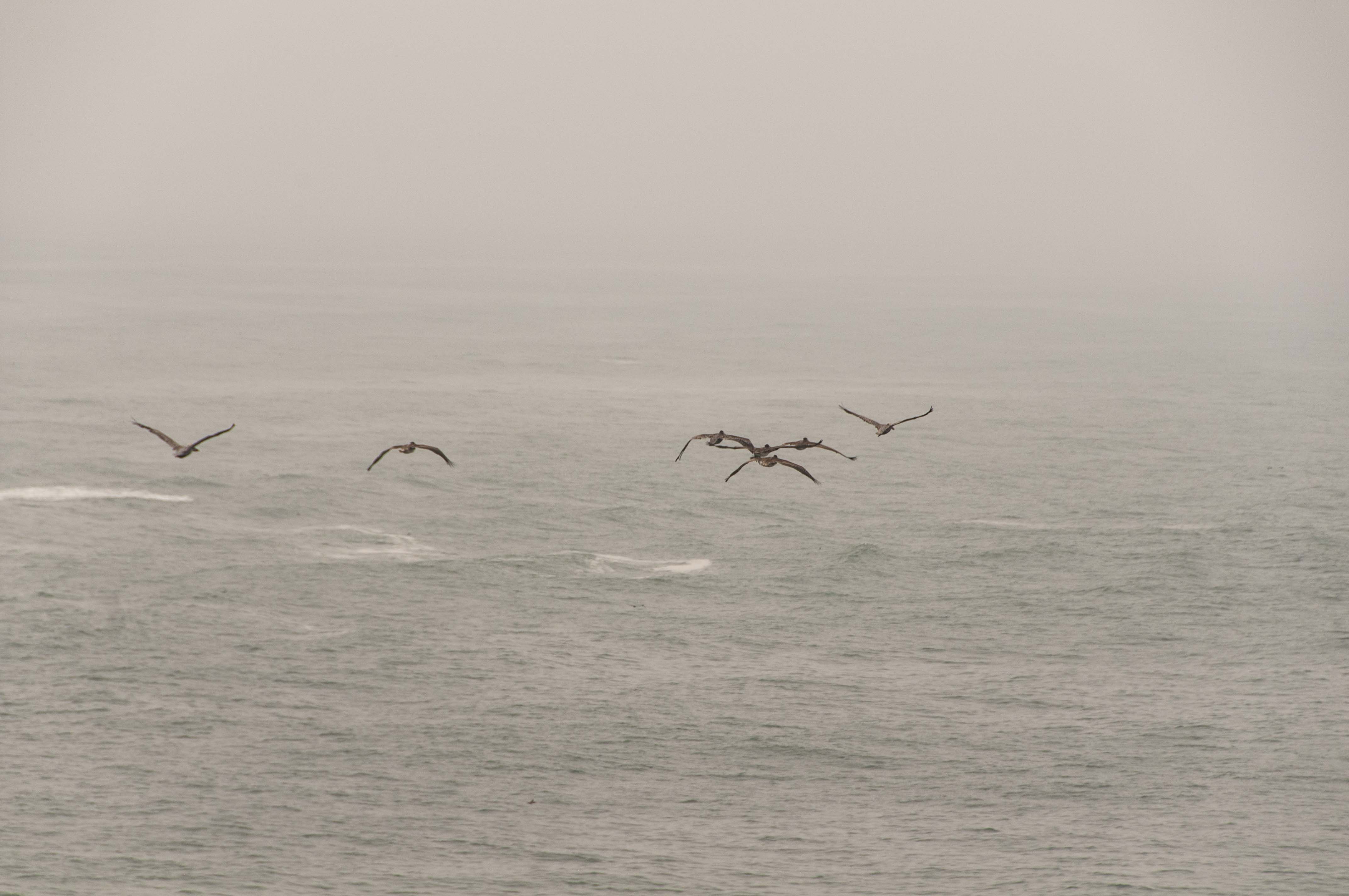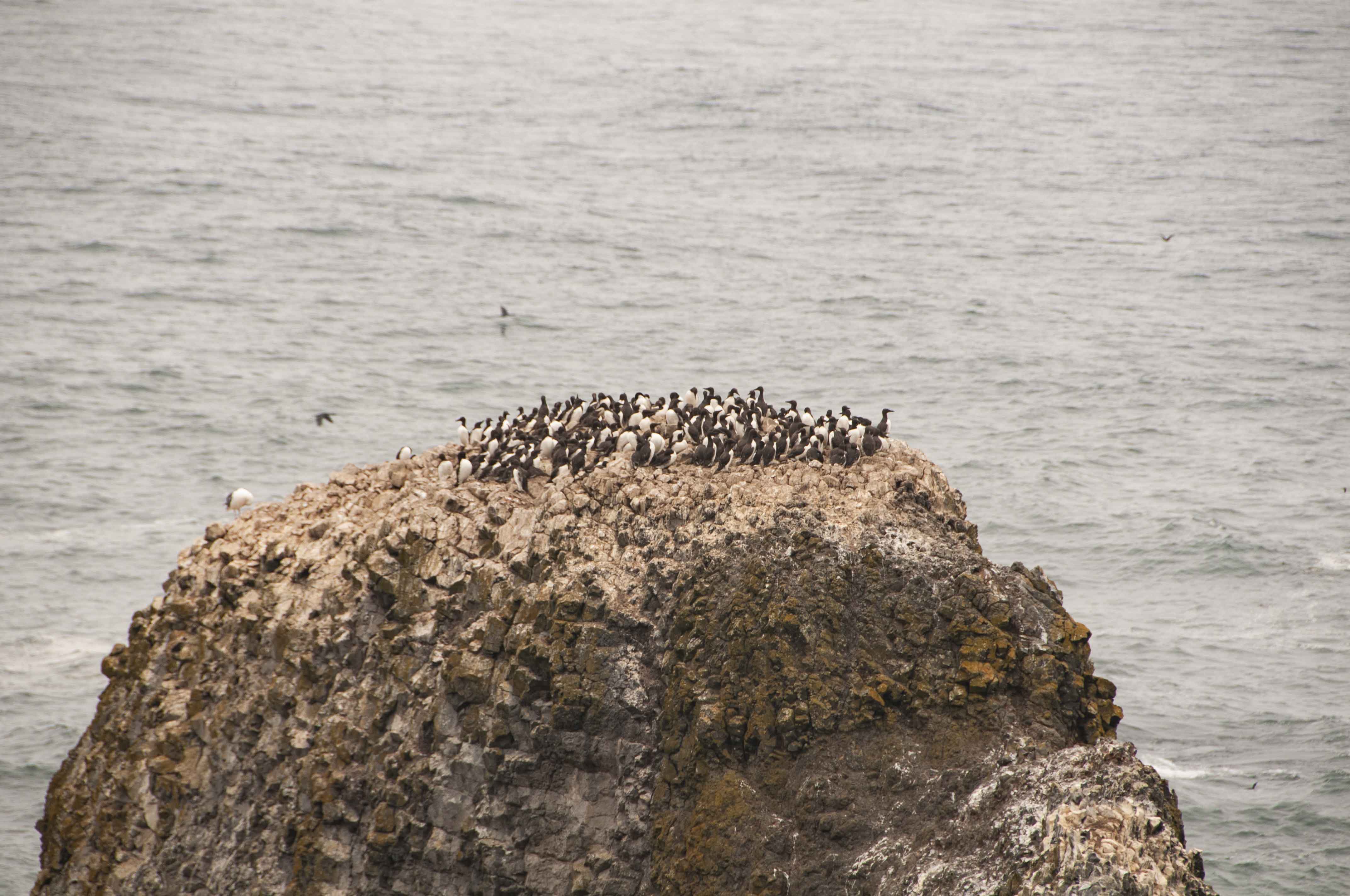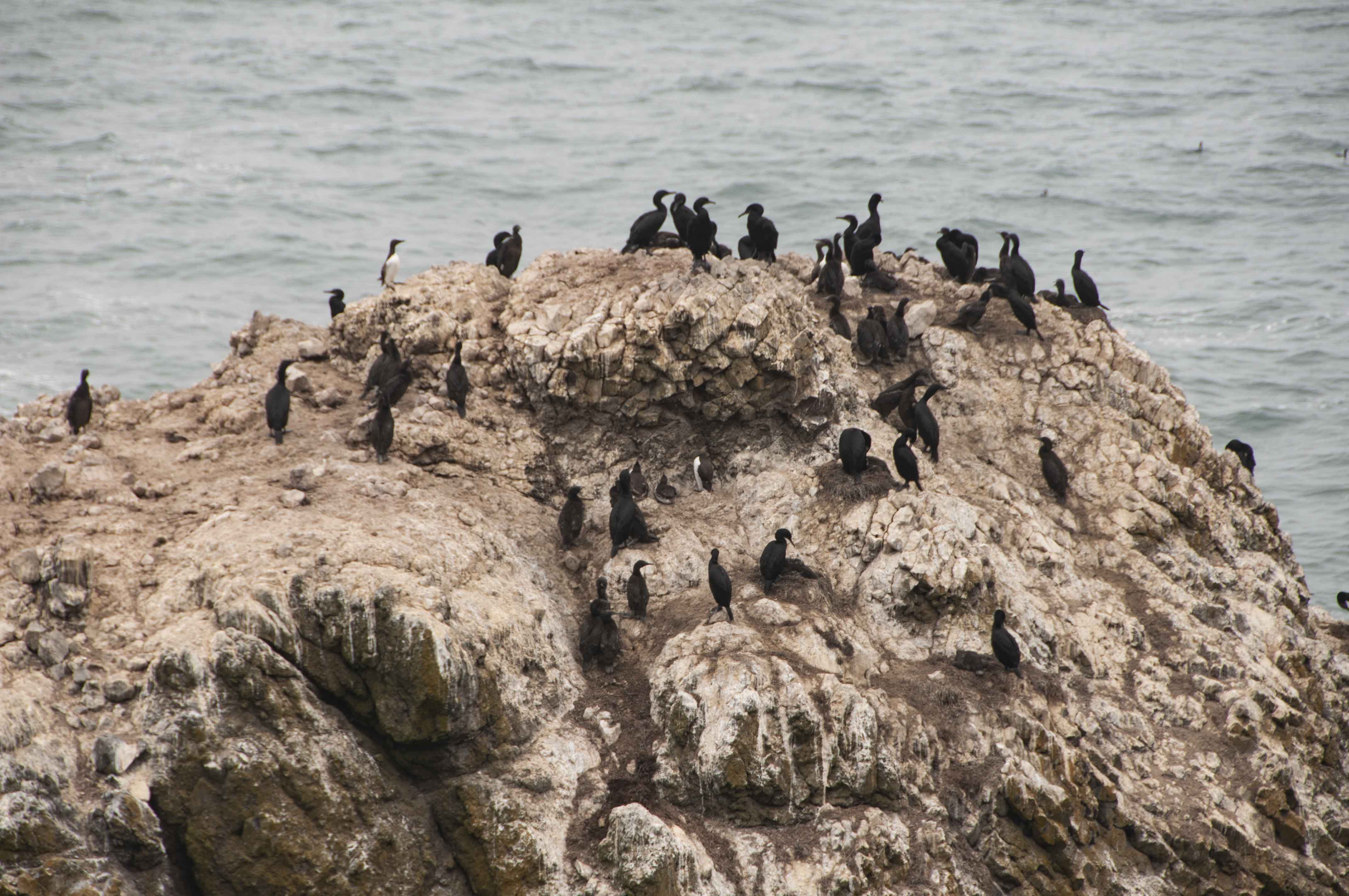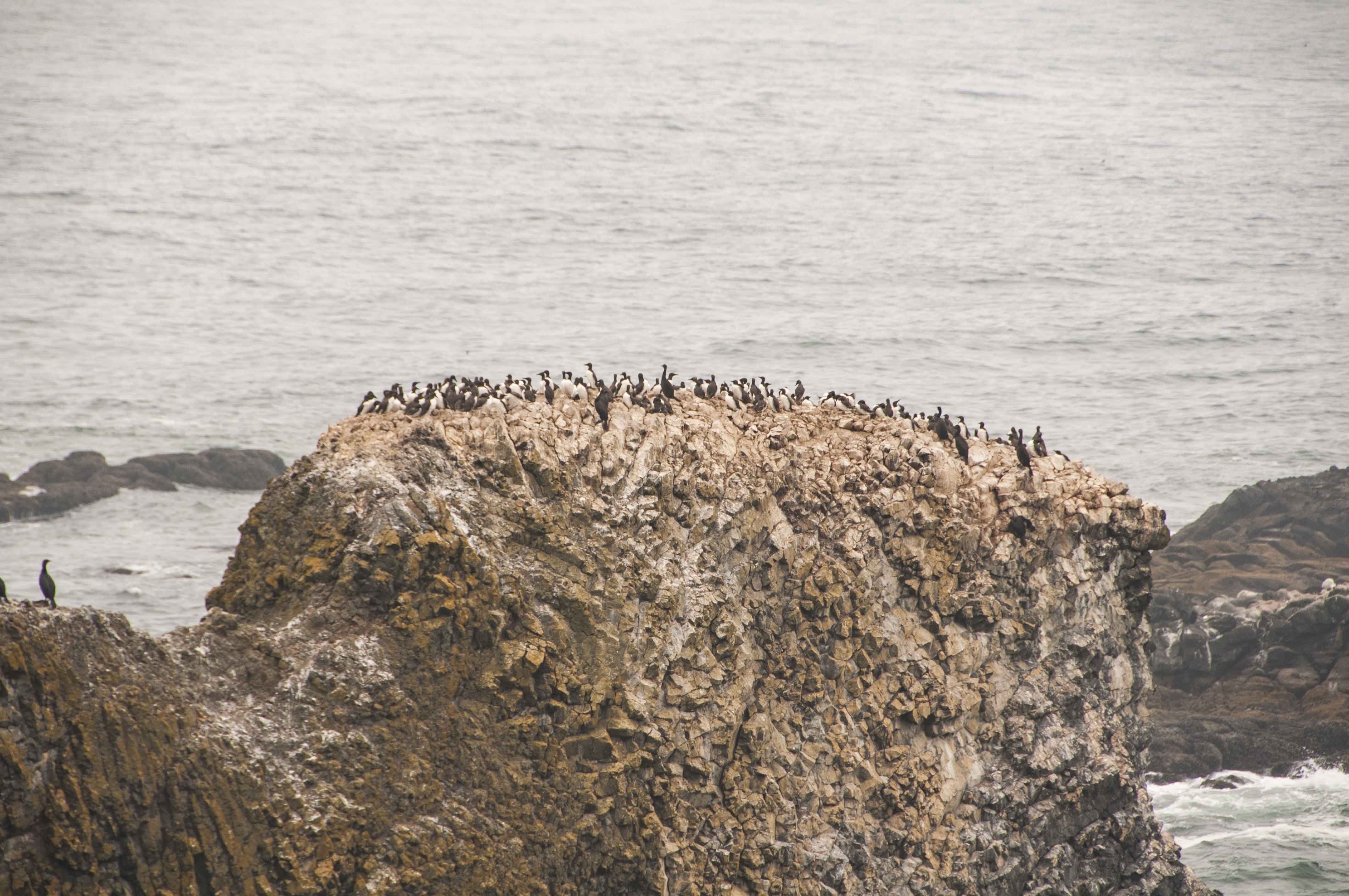 Ocean, rocks, birds, people